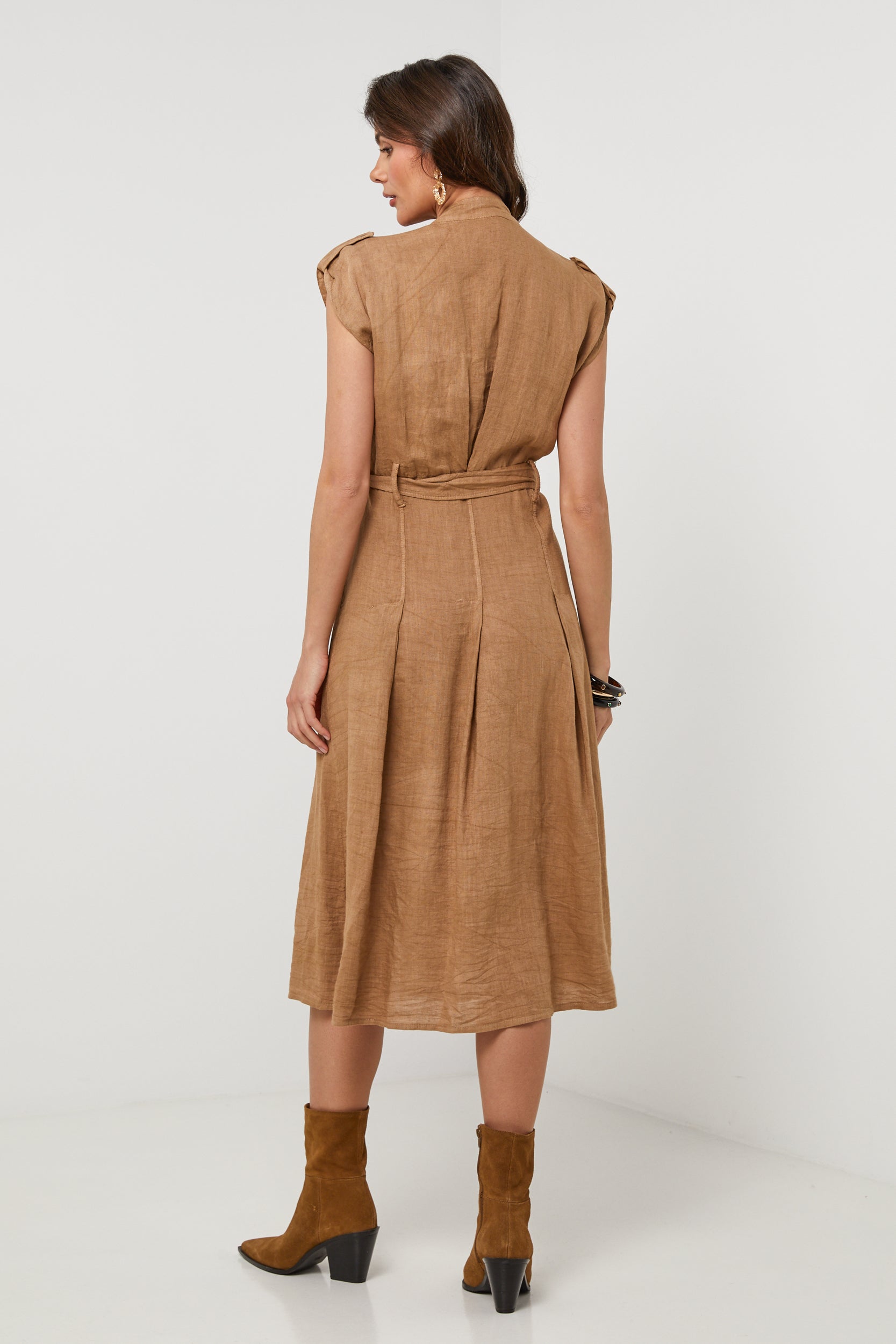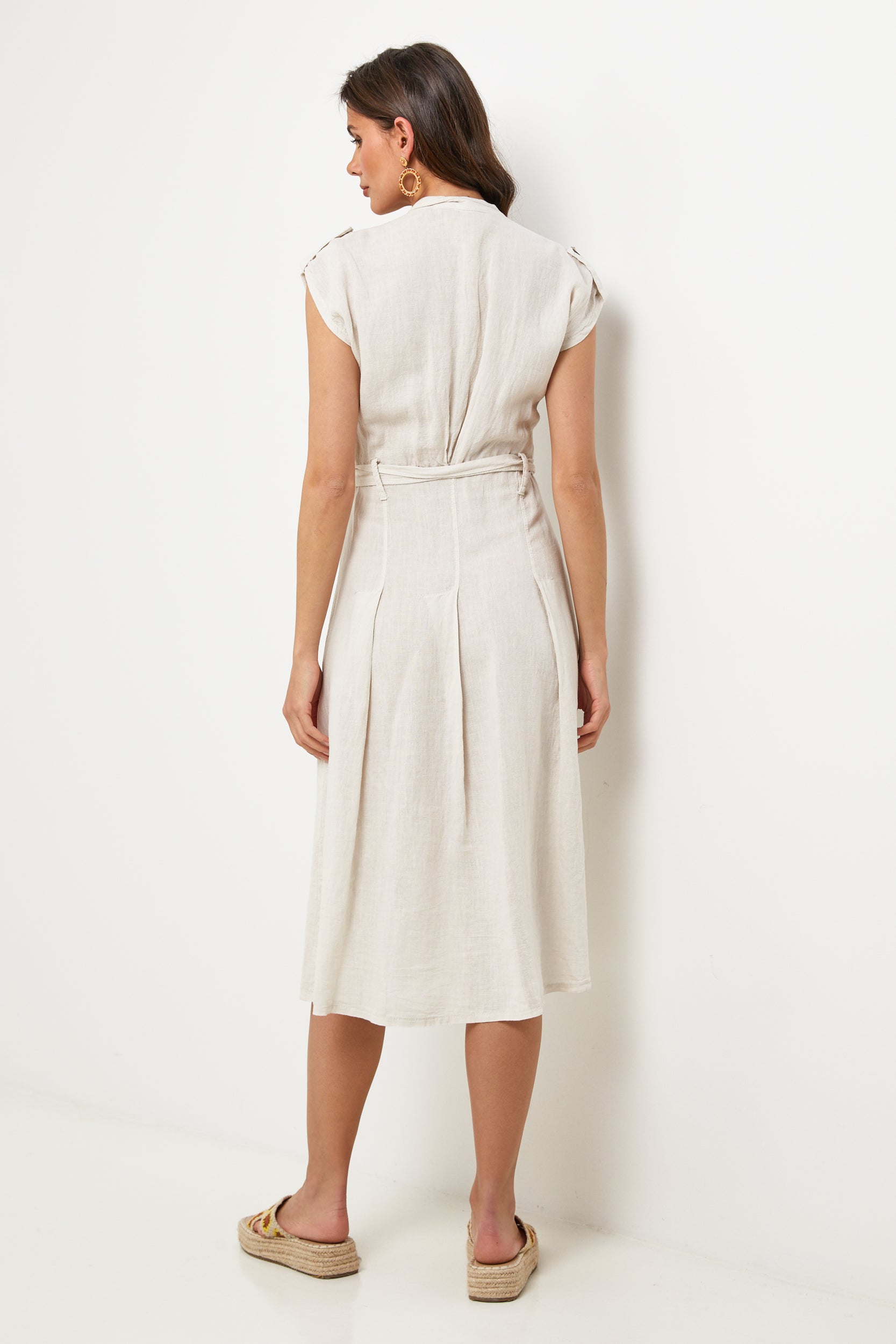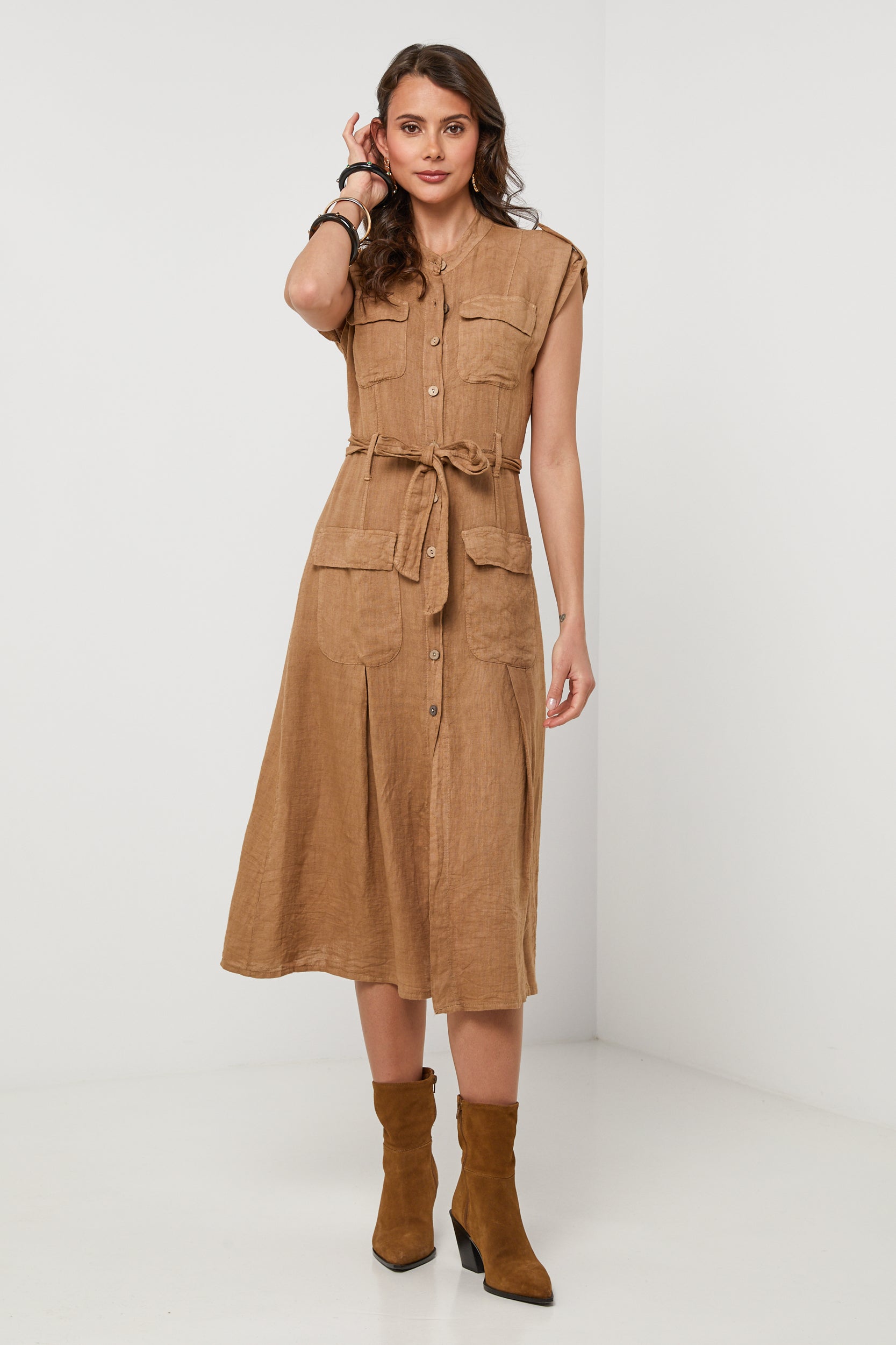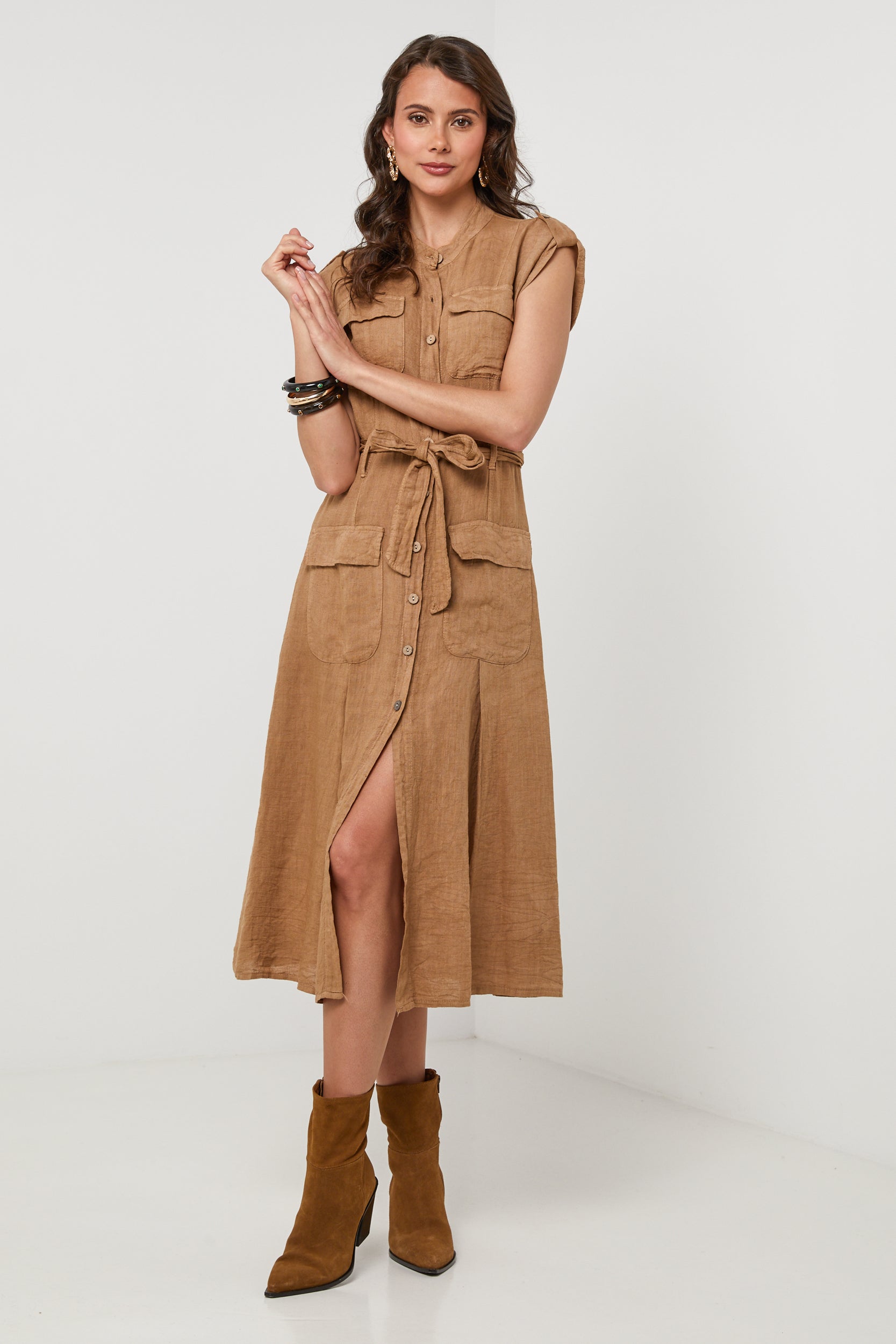 Robe chemise midi col mao, fermeture boutonnée, ceinturée, manches courtes, avec des poches plaquées au niveau du poitrine