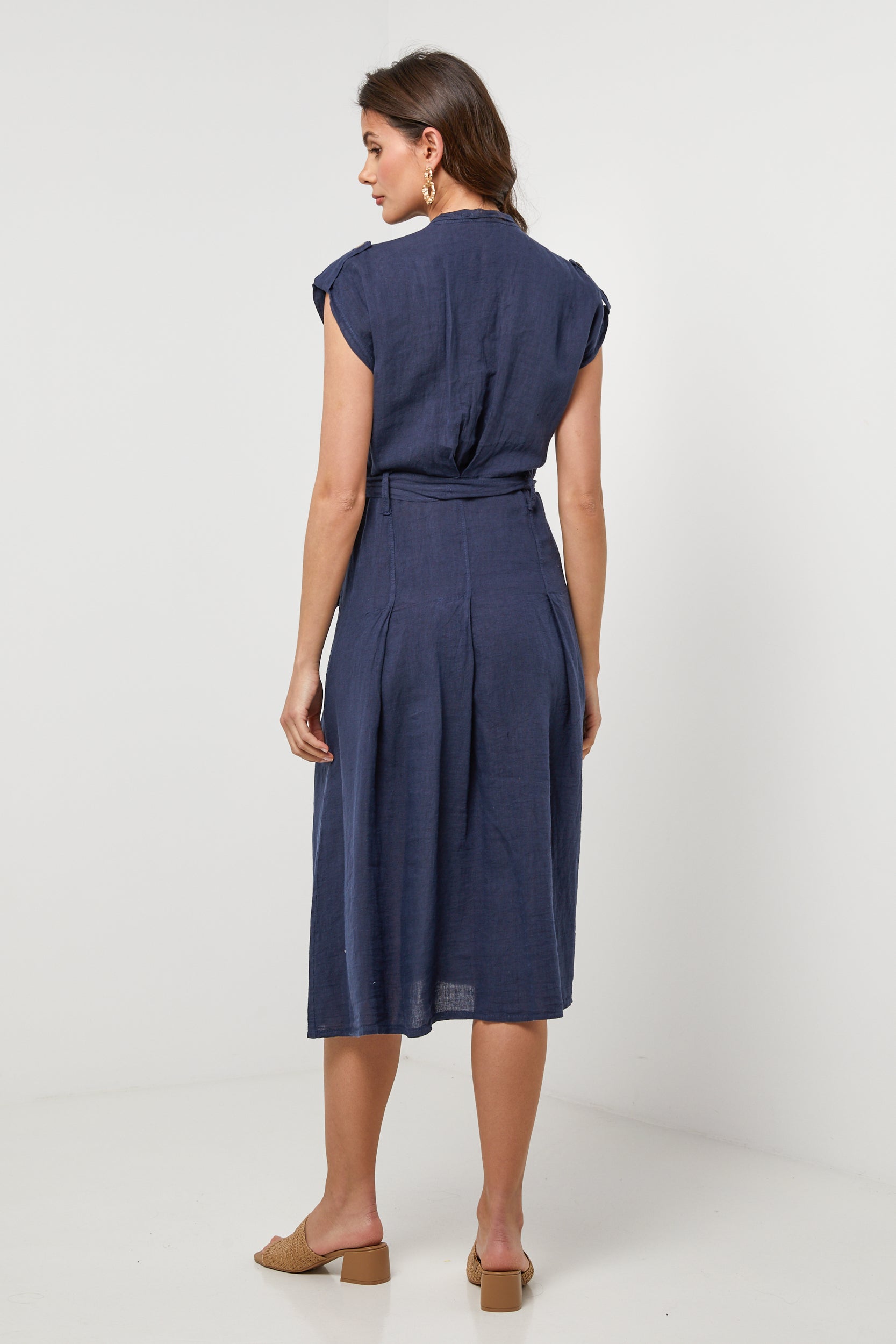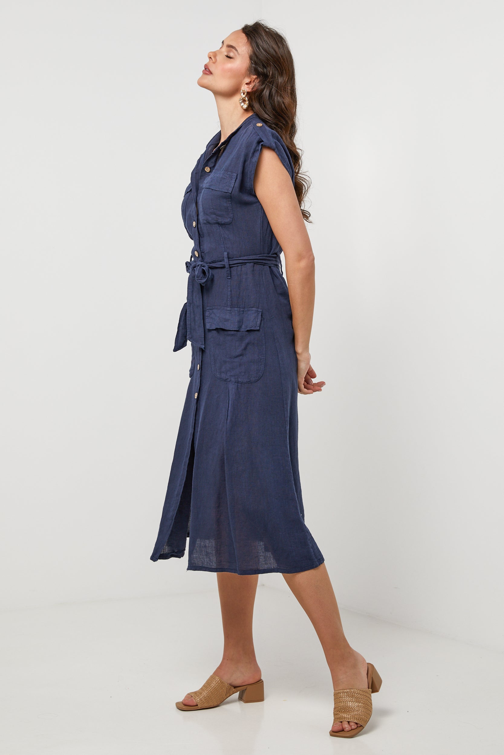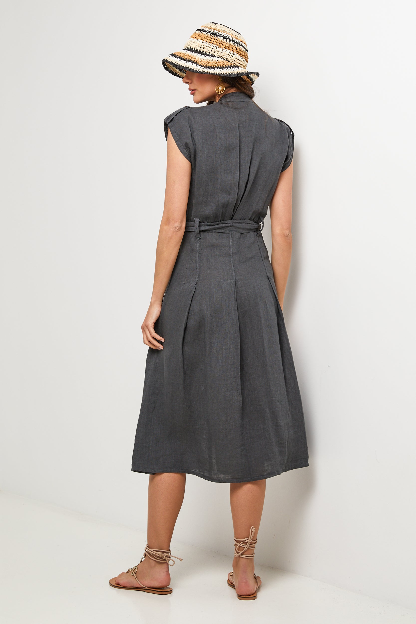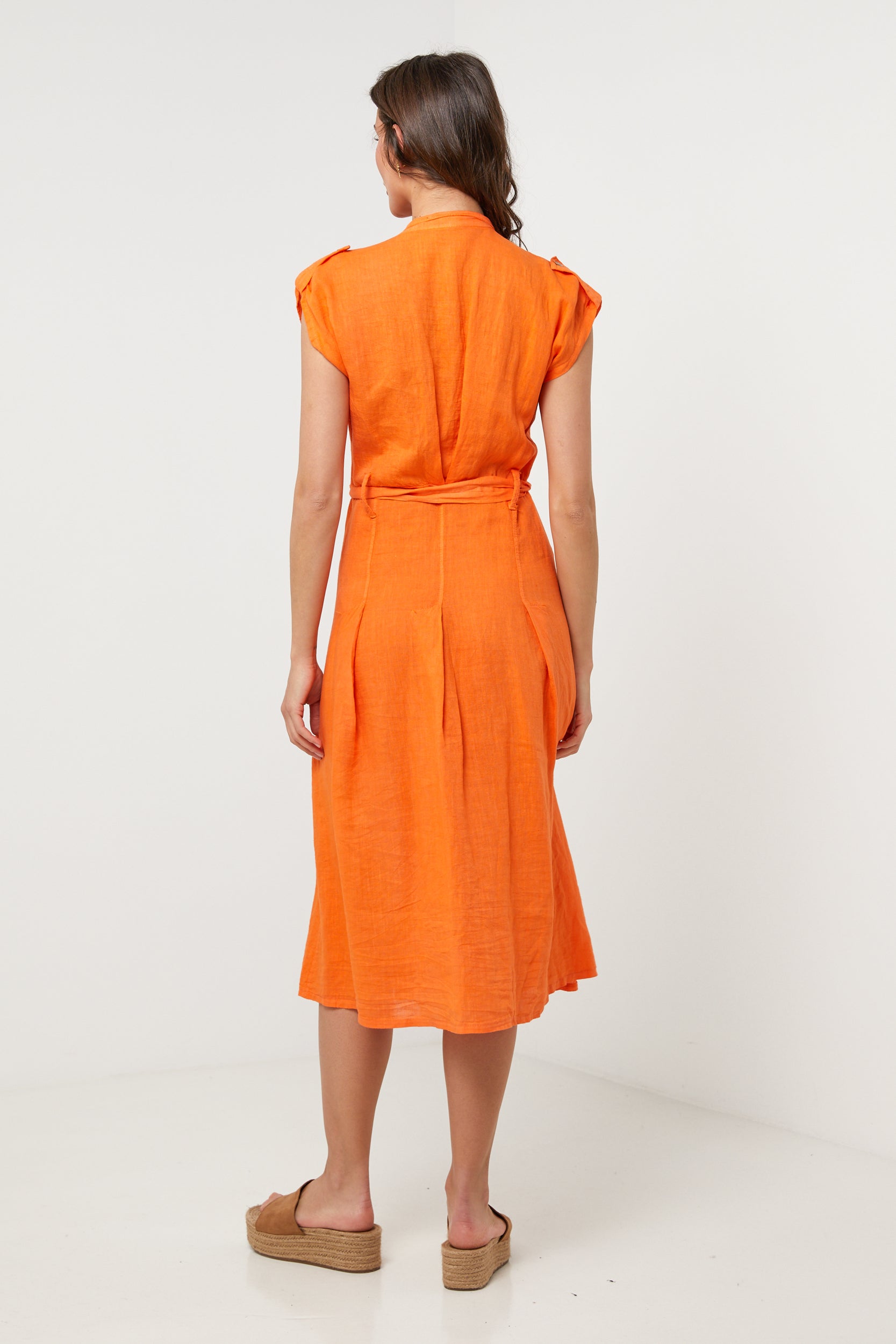 Robe chemise midi col mao, fermeture boutonnée, ceinturée, manches courtes, avec des poches plaquées au niveau du poitrine