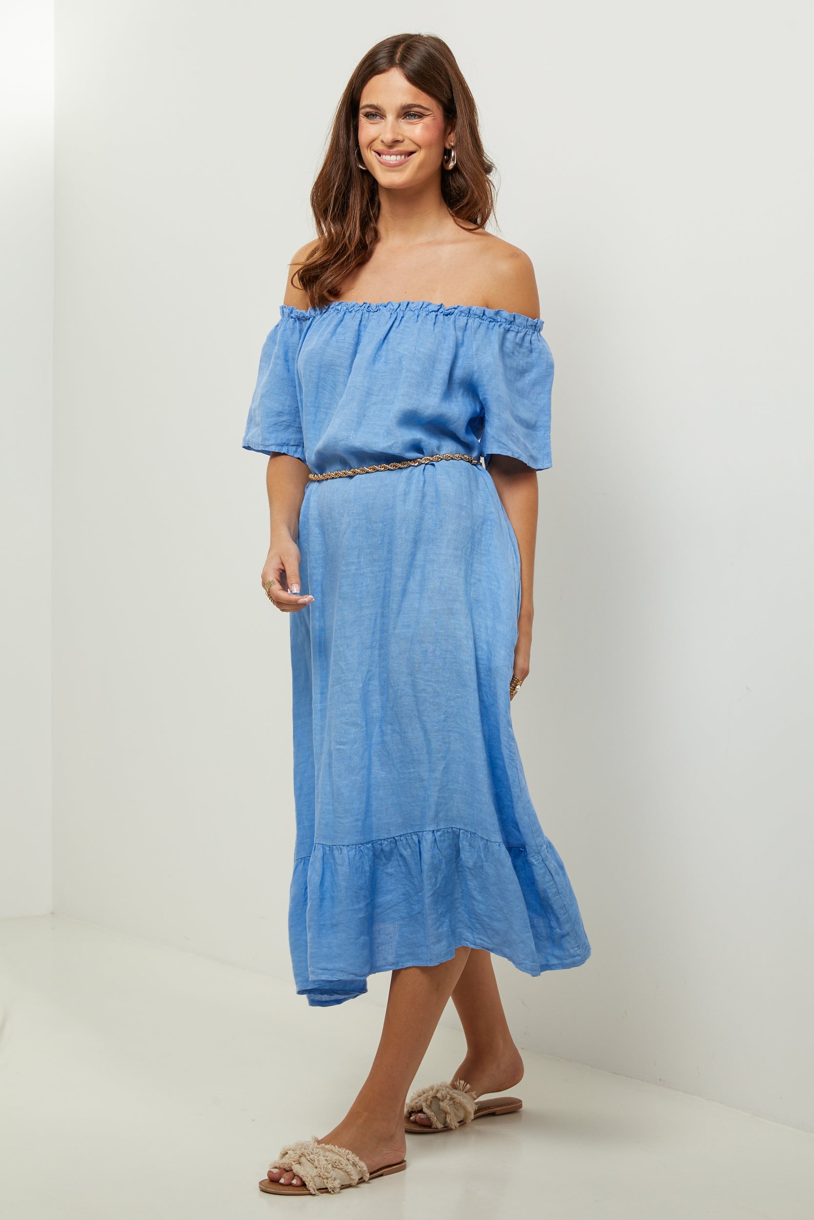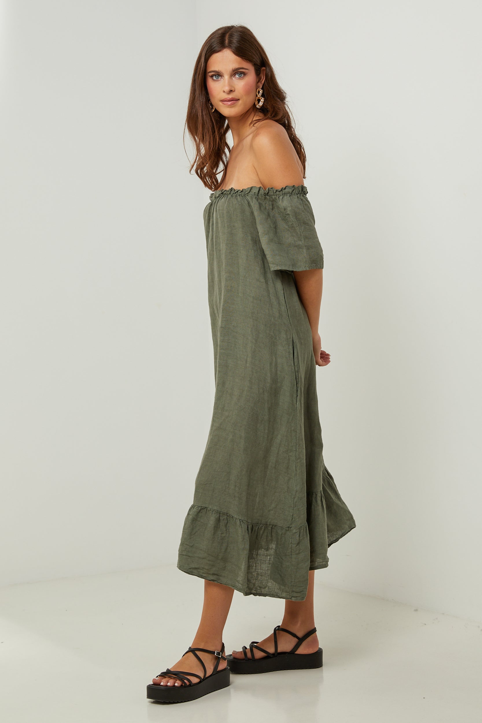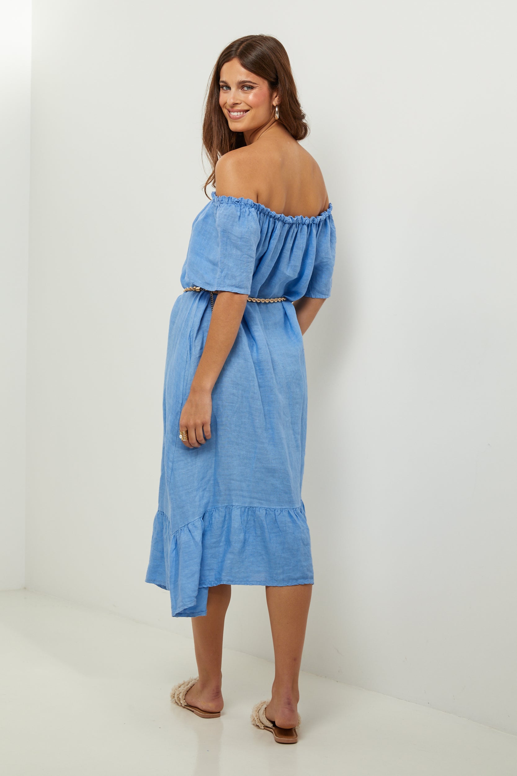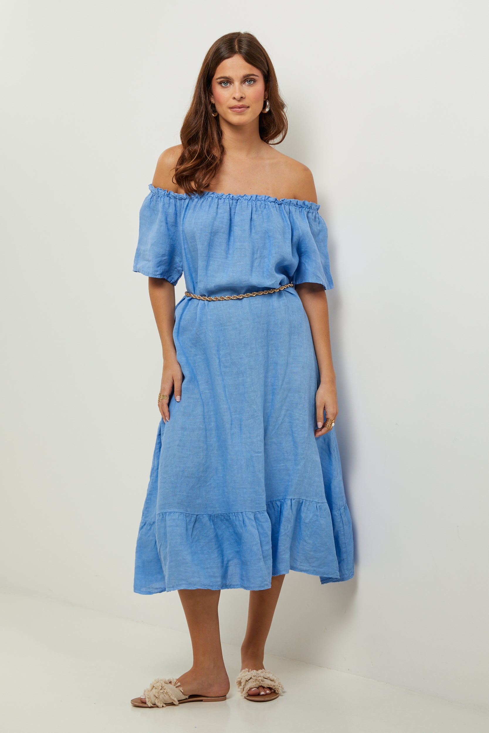 Robe midi à manches courtes à volants, encolure élastique pour un porté épaules, et volant sur le bas