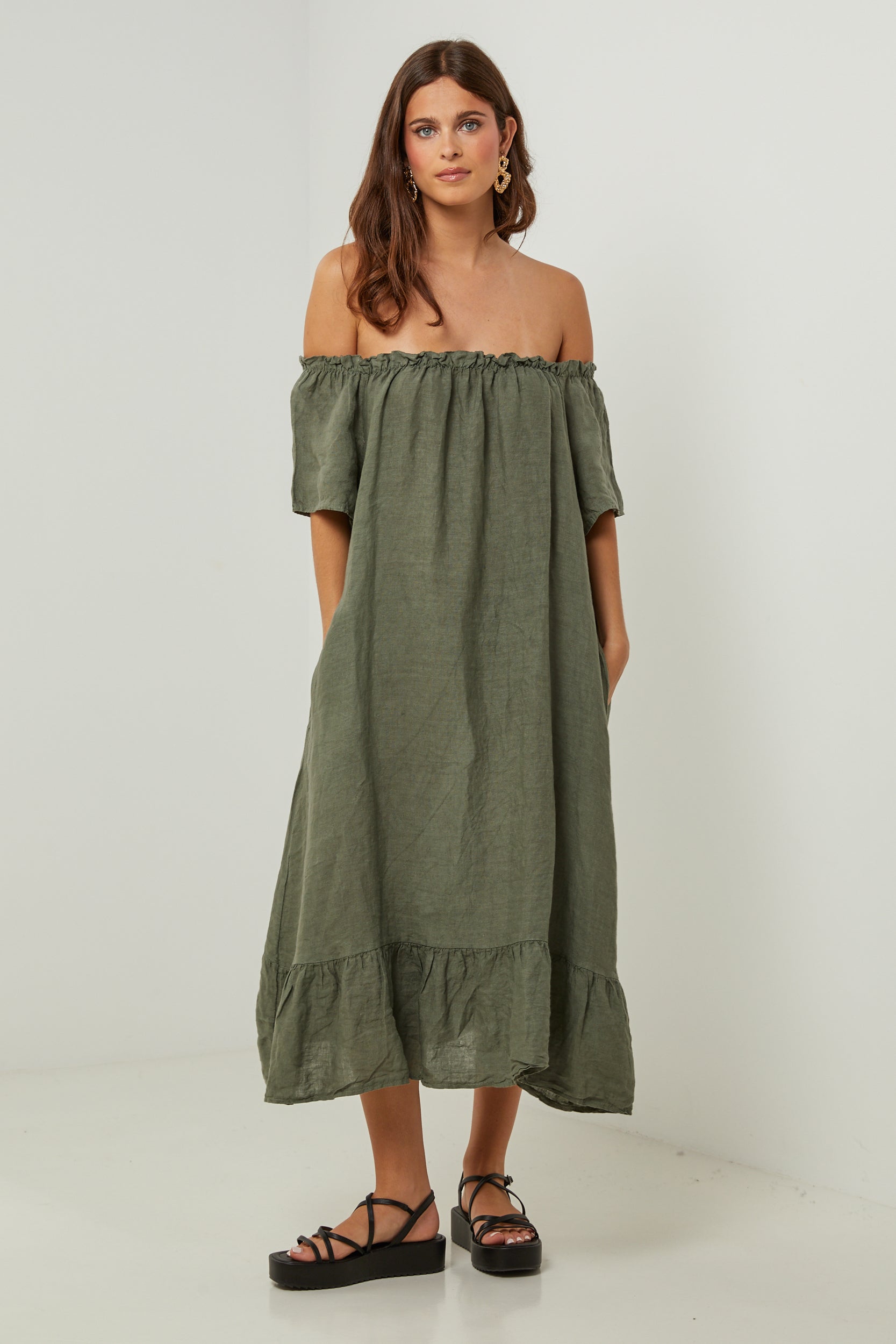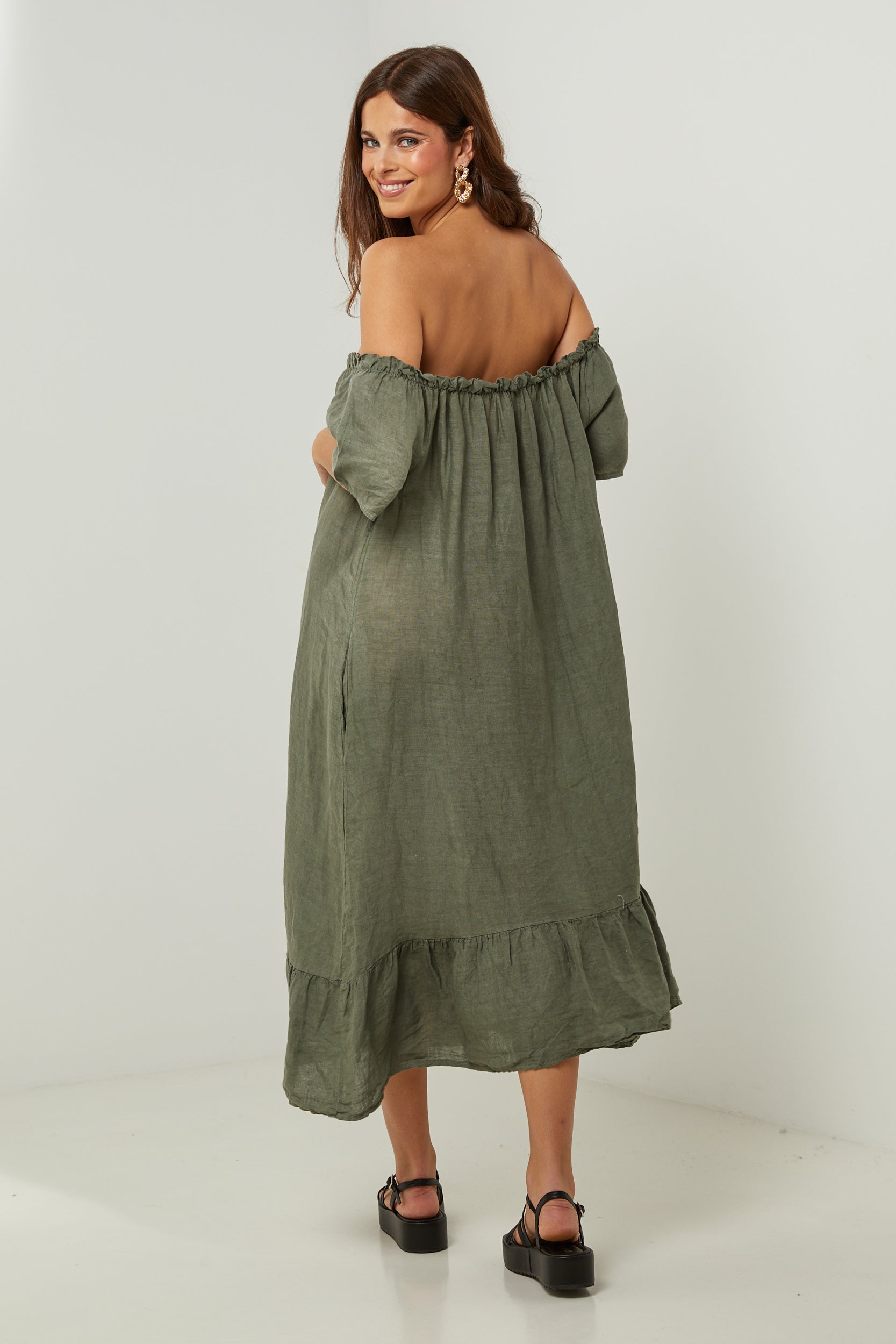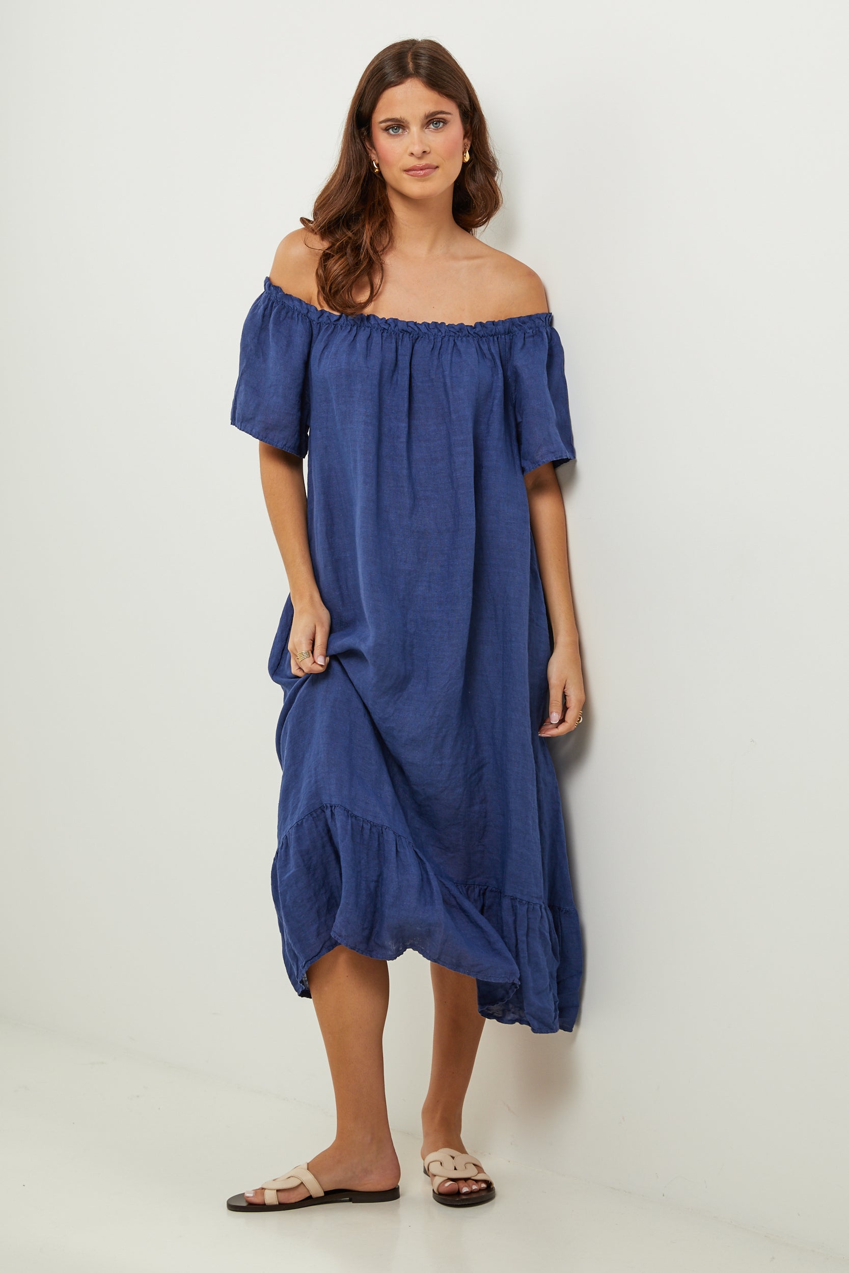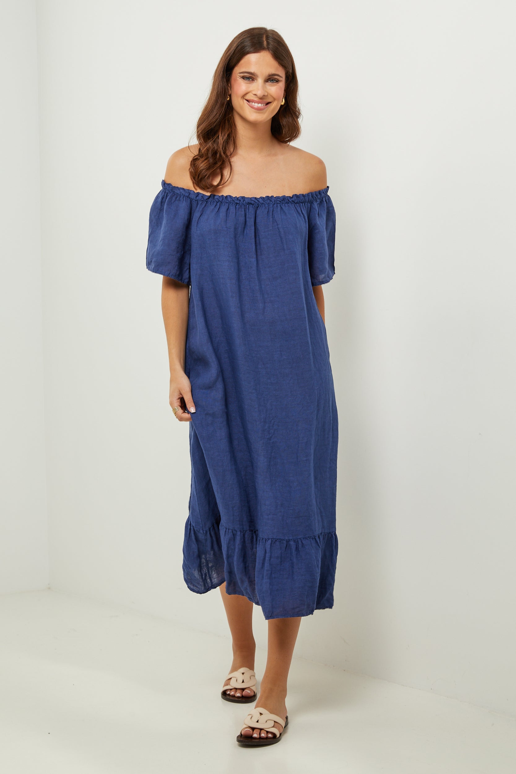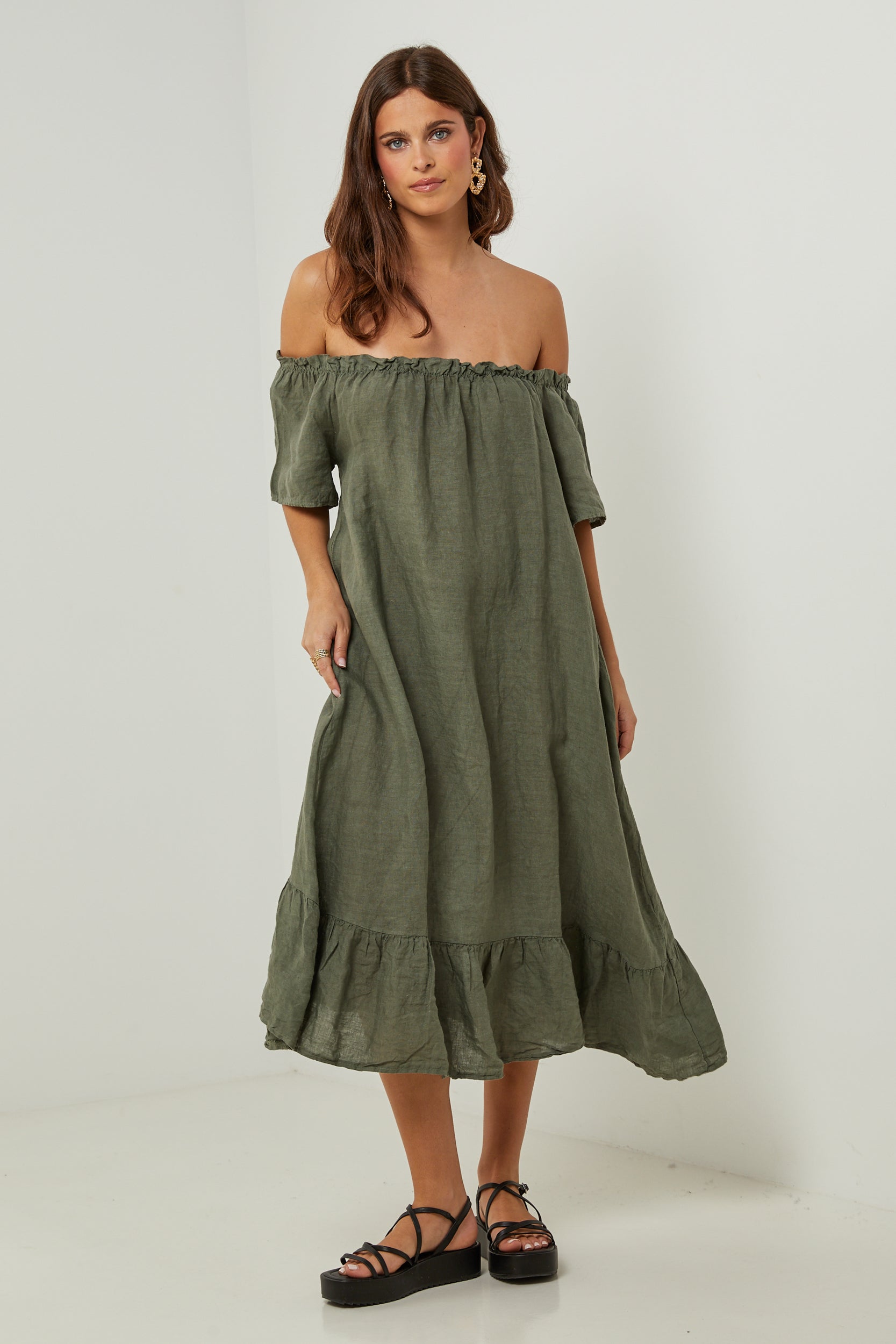 Robe midi à manches courtes à volants, encolure élastique pour un porté épaules, et volant sur le bas