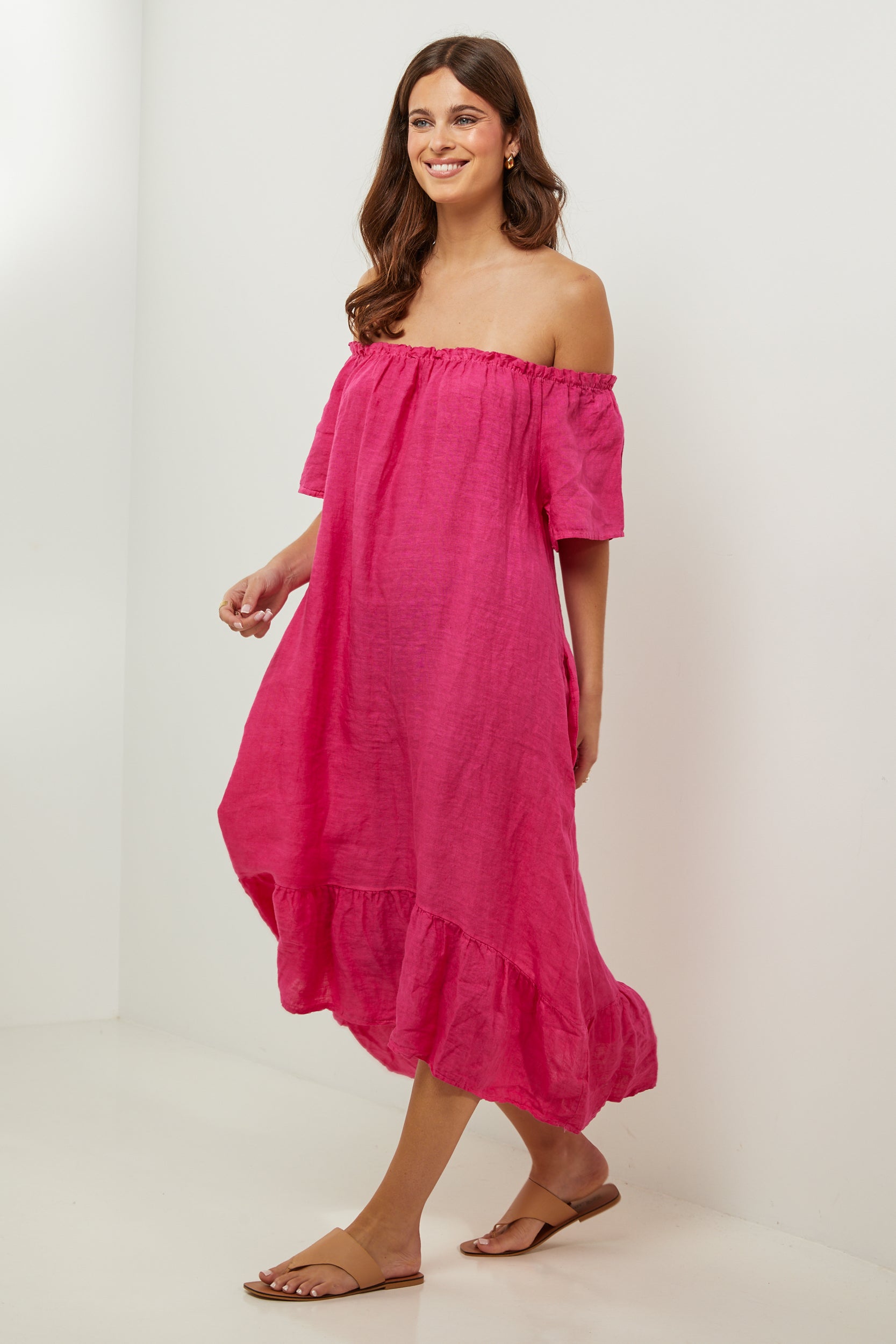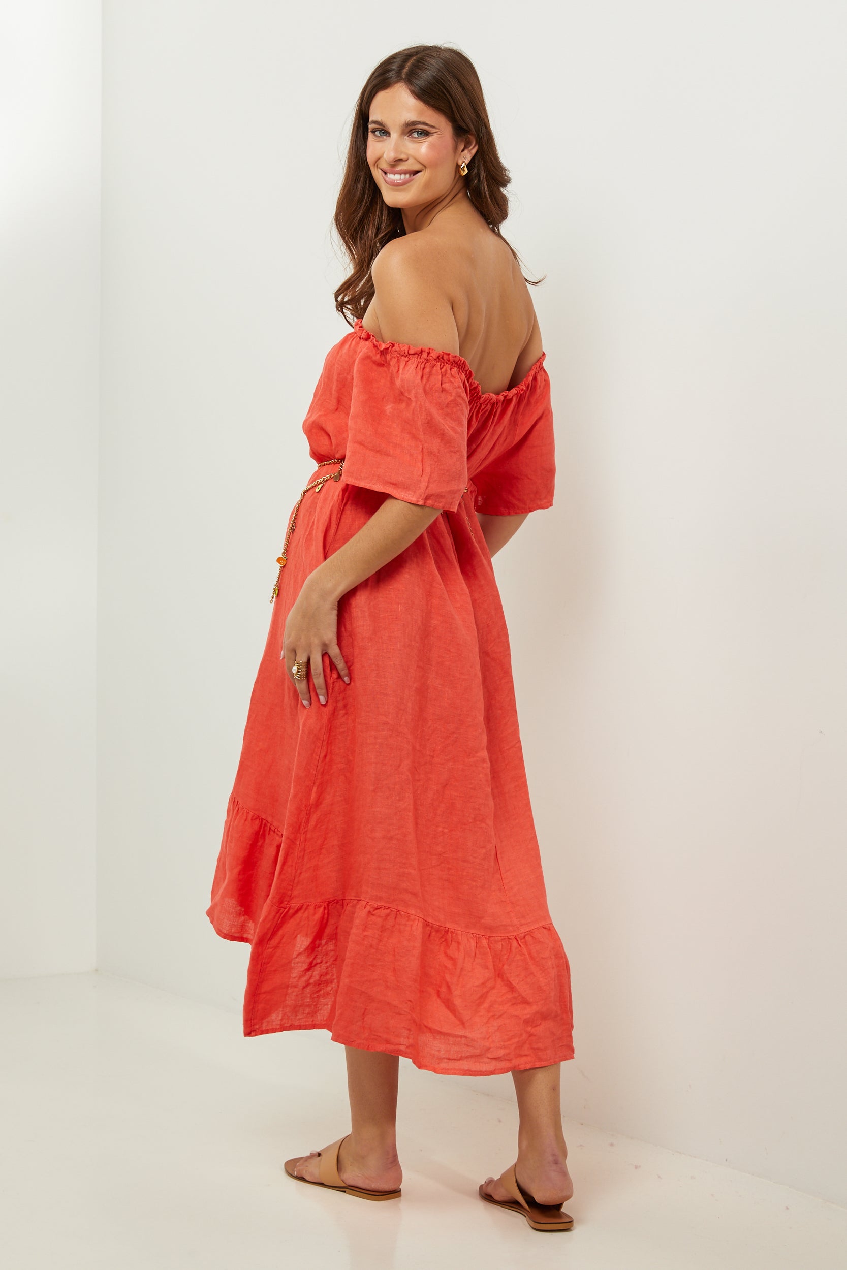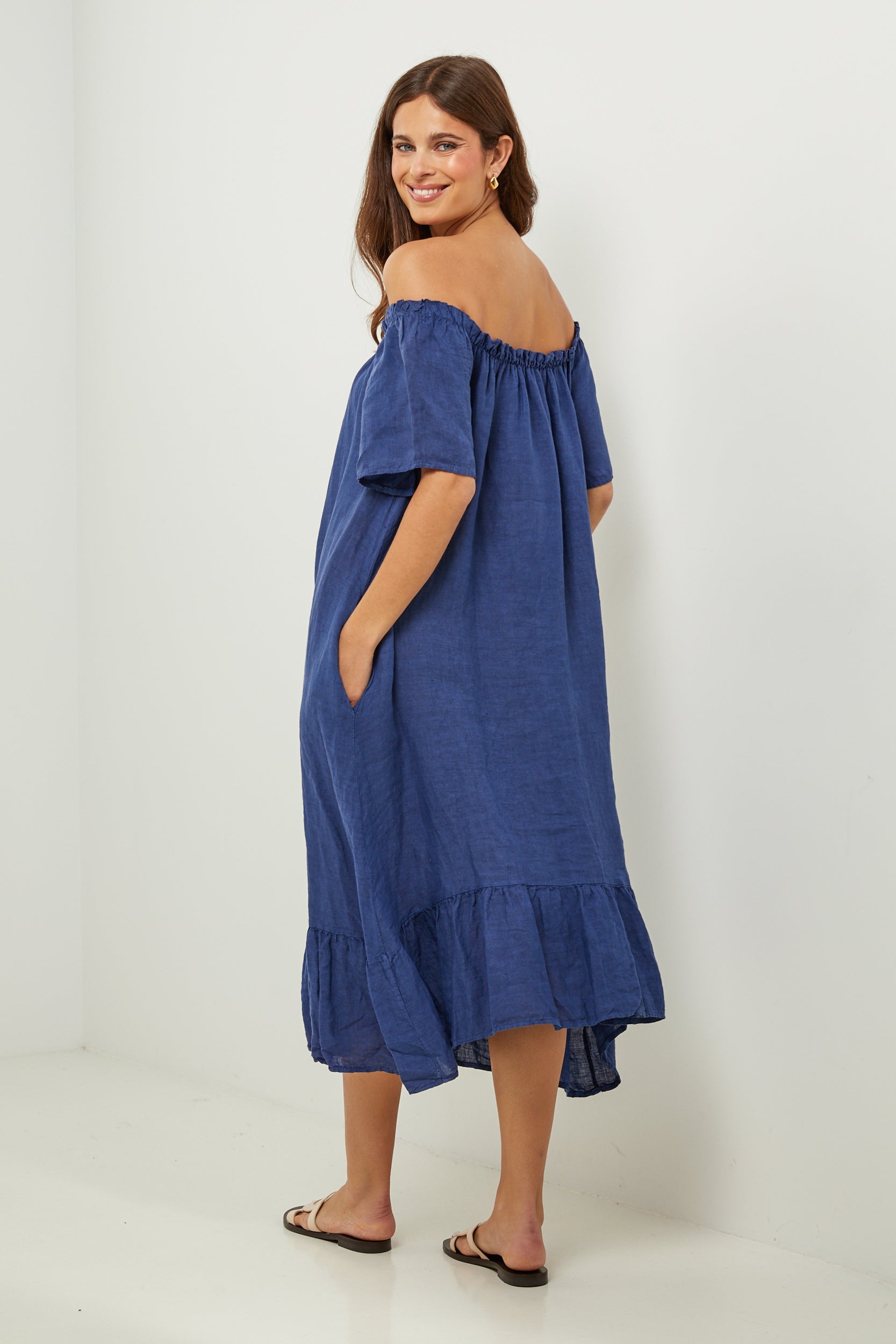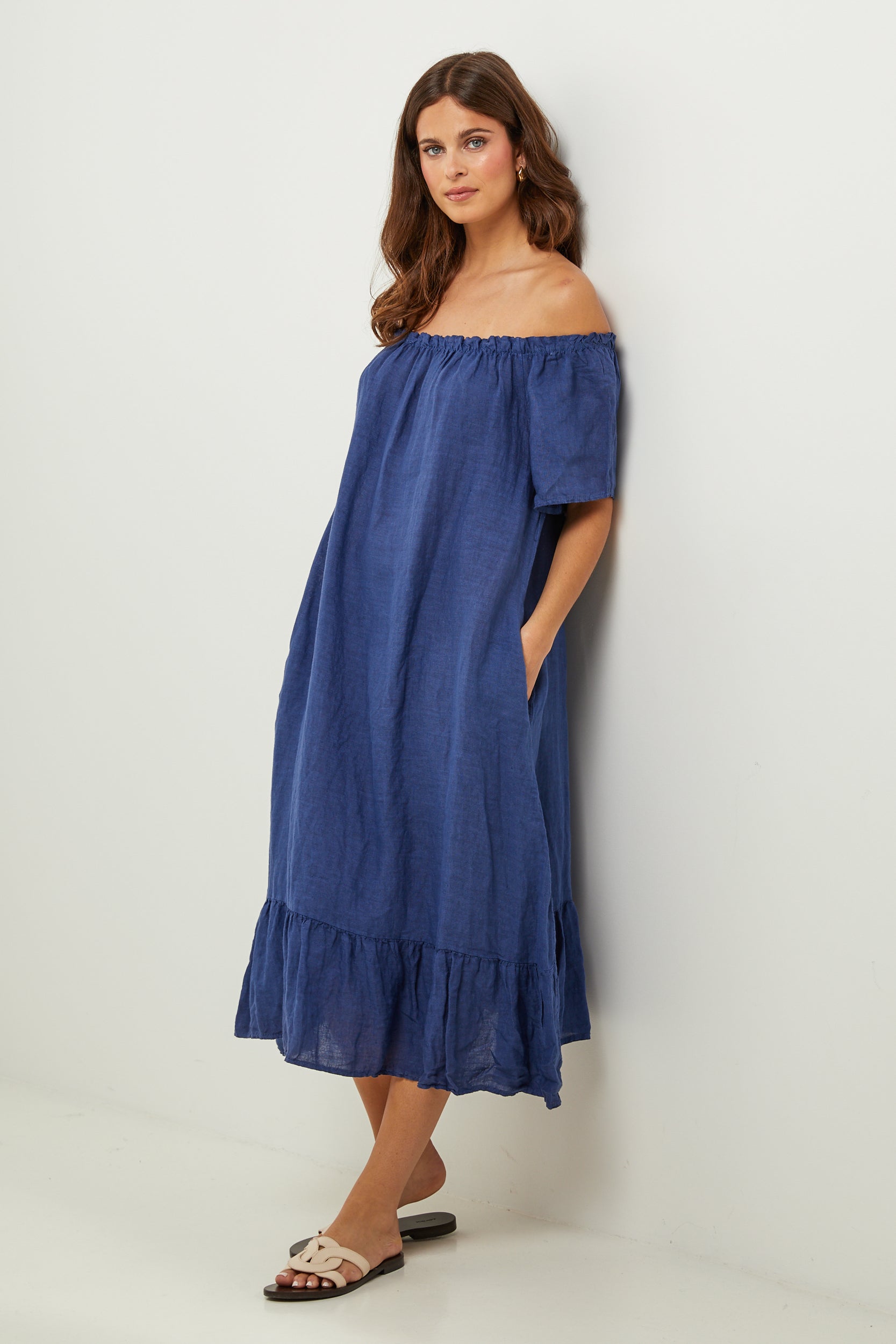 Robe midi à manches courtes à volants, encolure élastique pour un porté épaules, et volant sur le bas