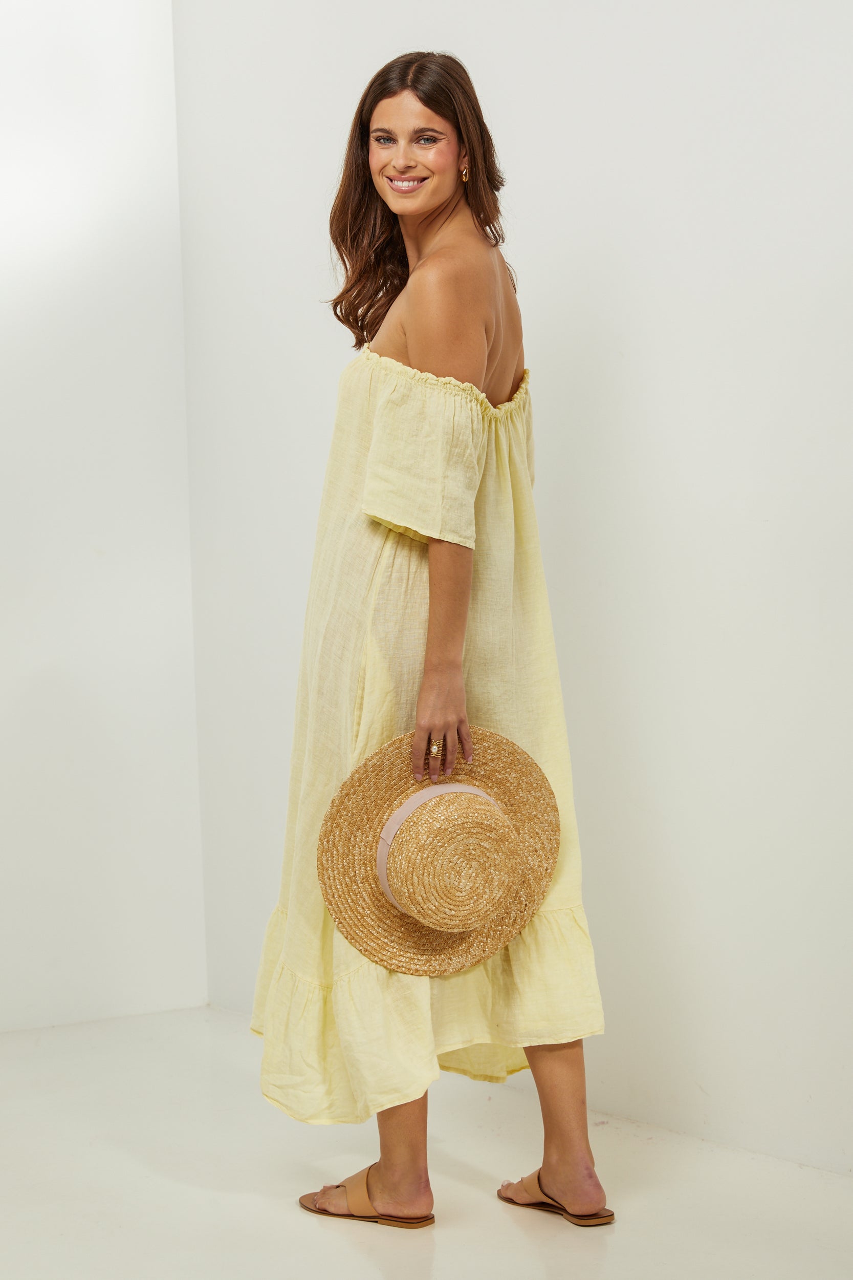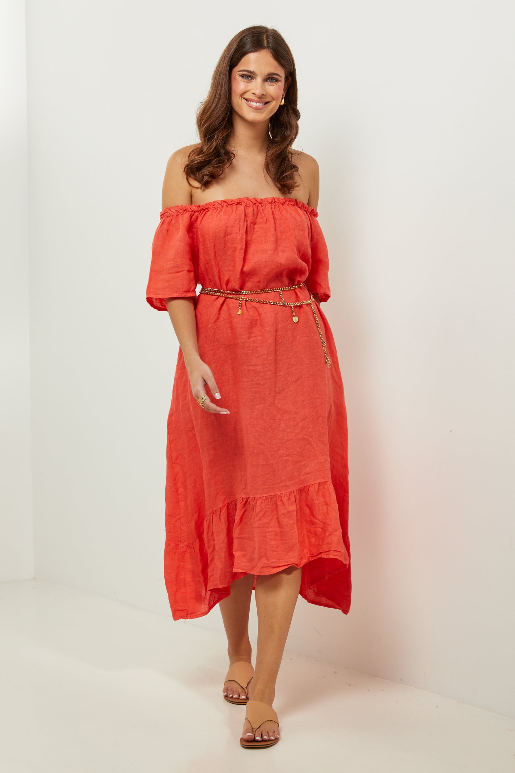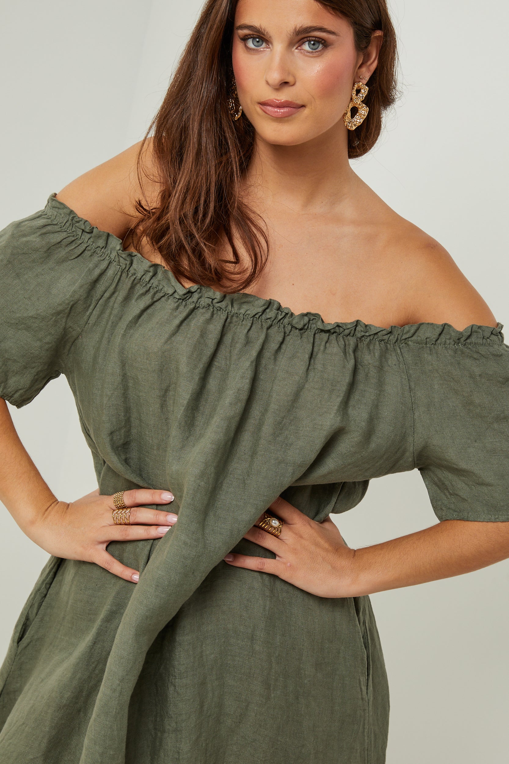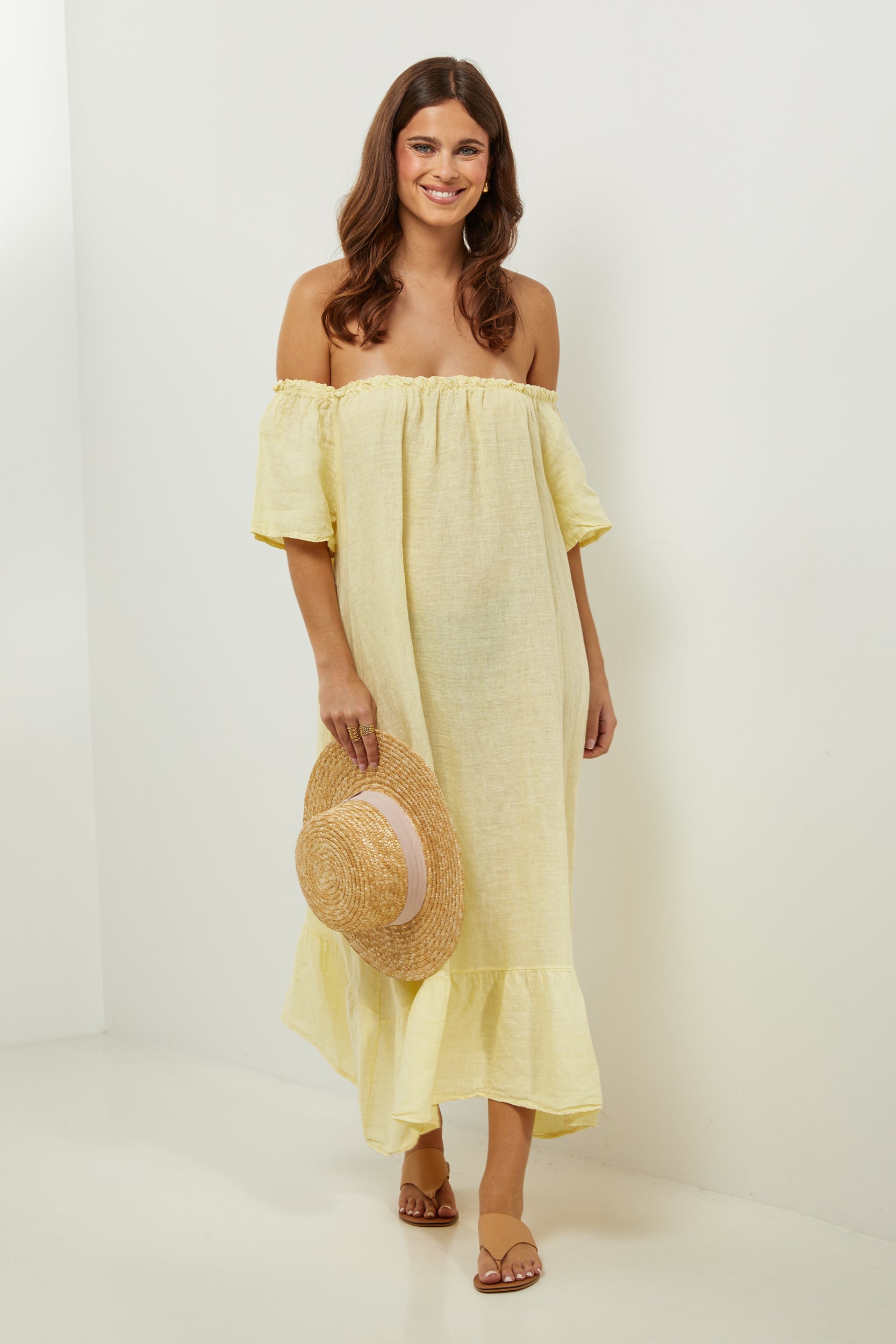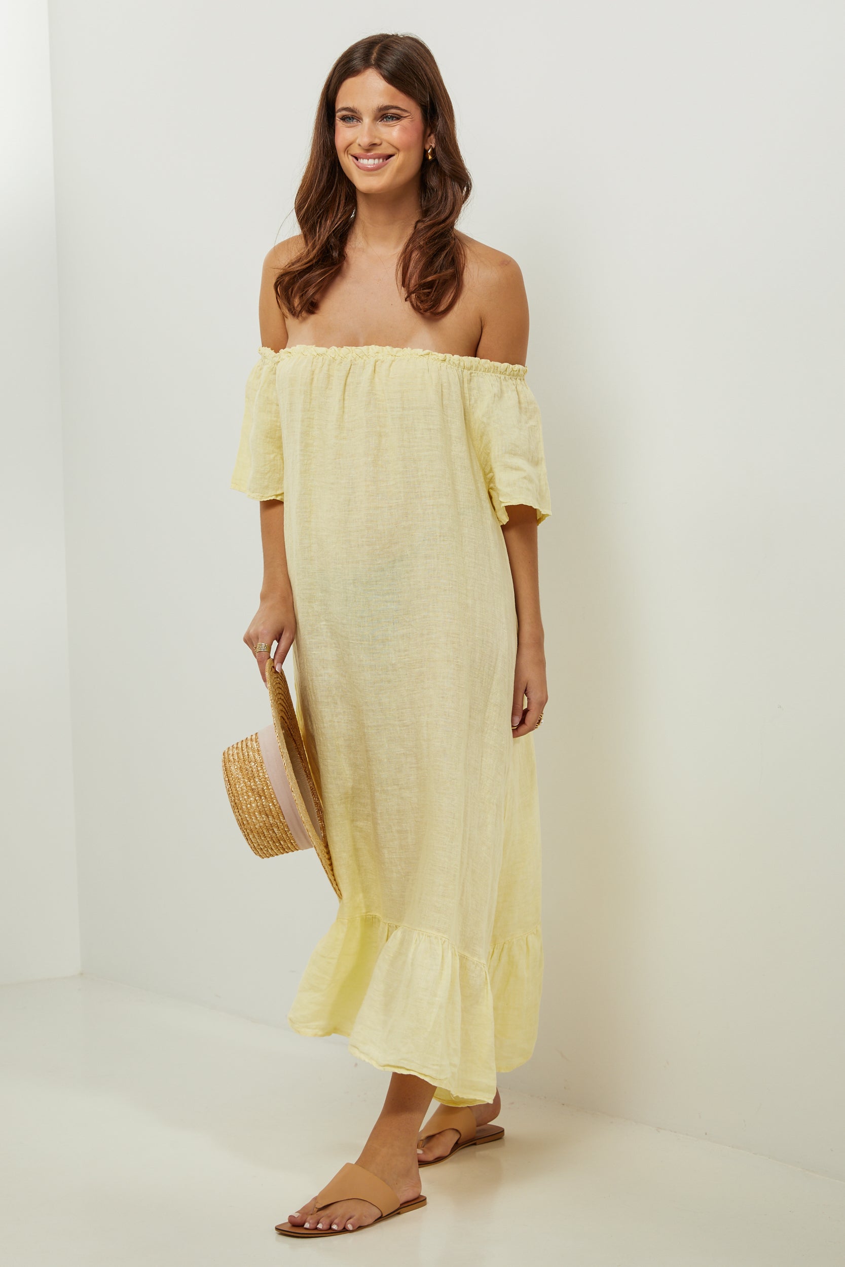 Robe midi à manches courtes à volants, encolure élastique pour un porté épaules, et volant sur le bas