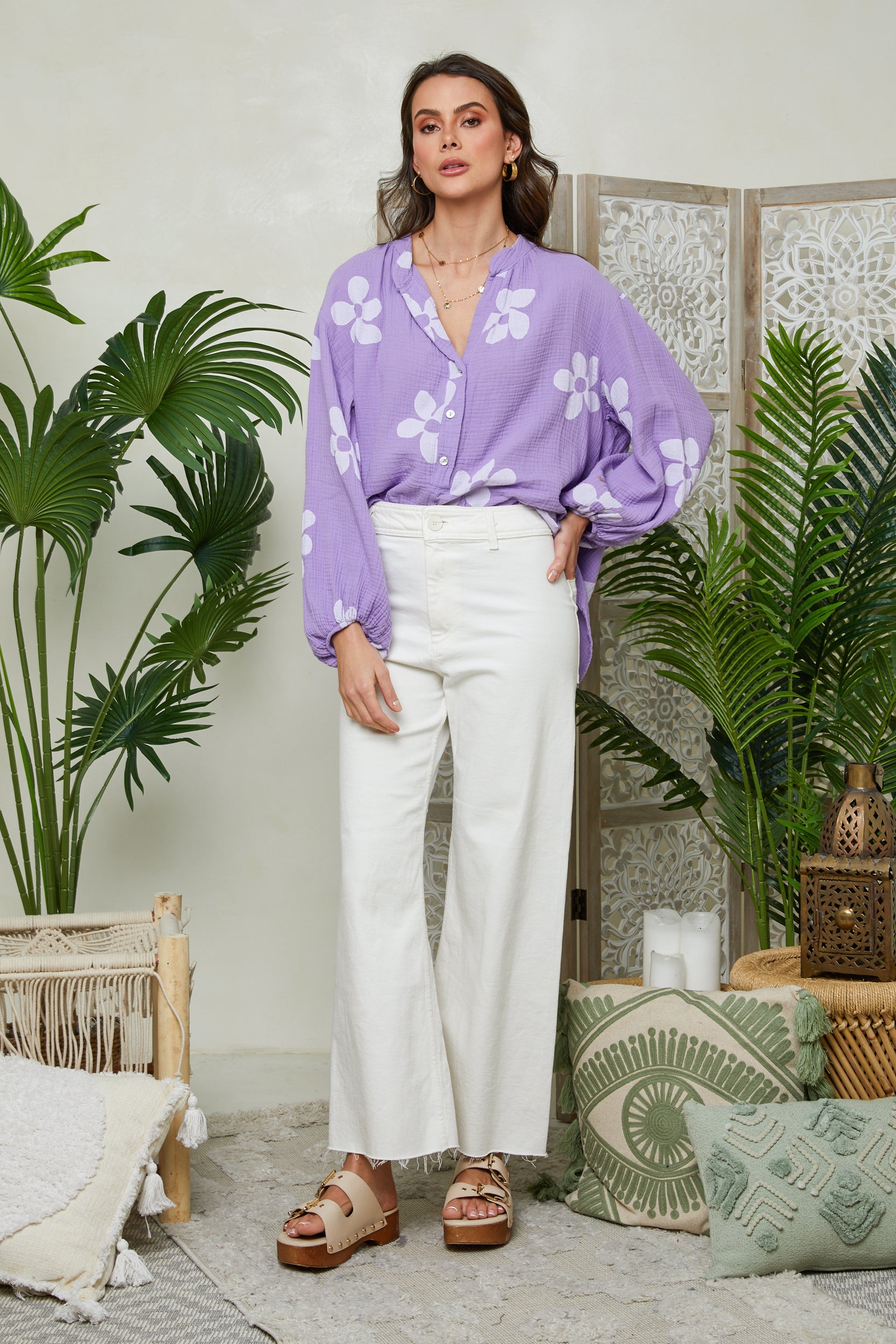 Chemise imprimée fleurie col mao, manches longues, serré aux poignets