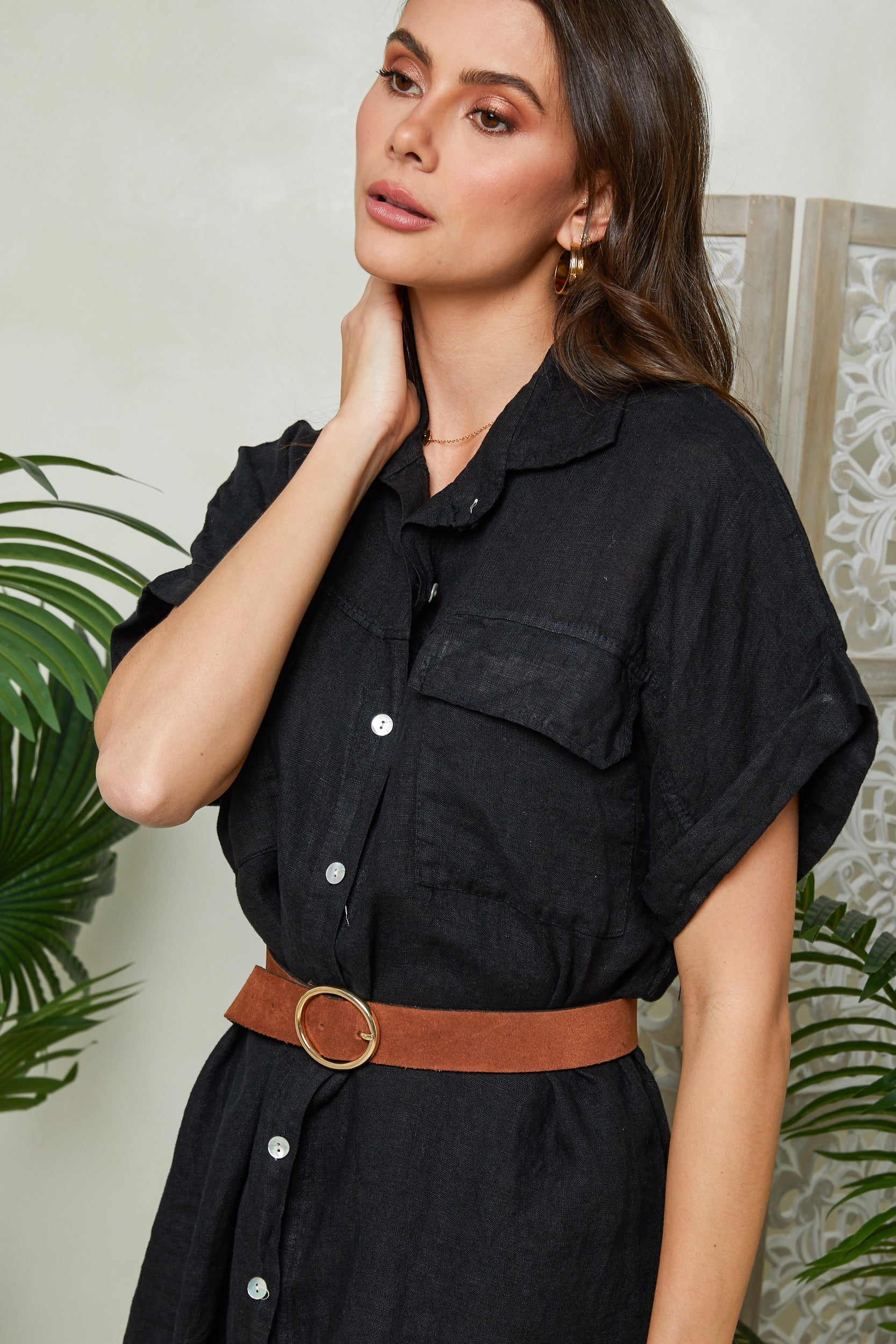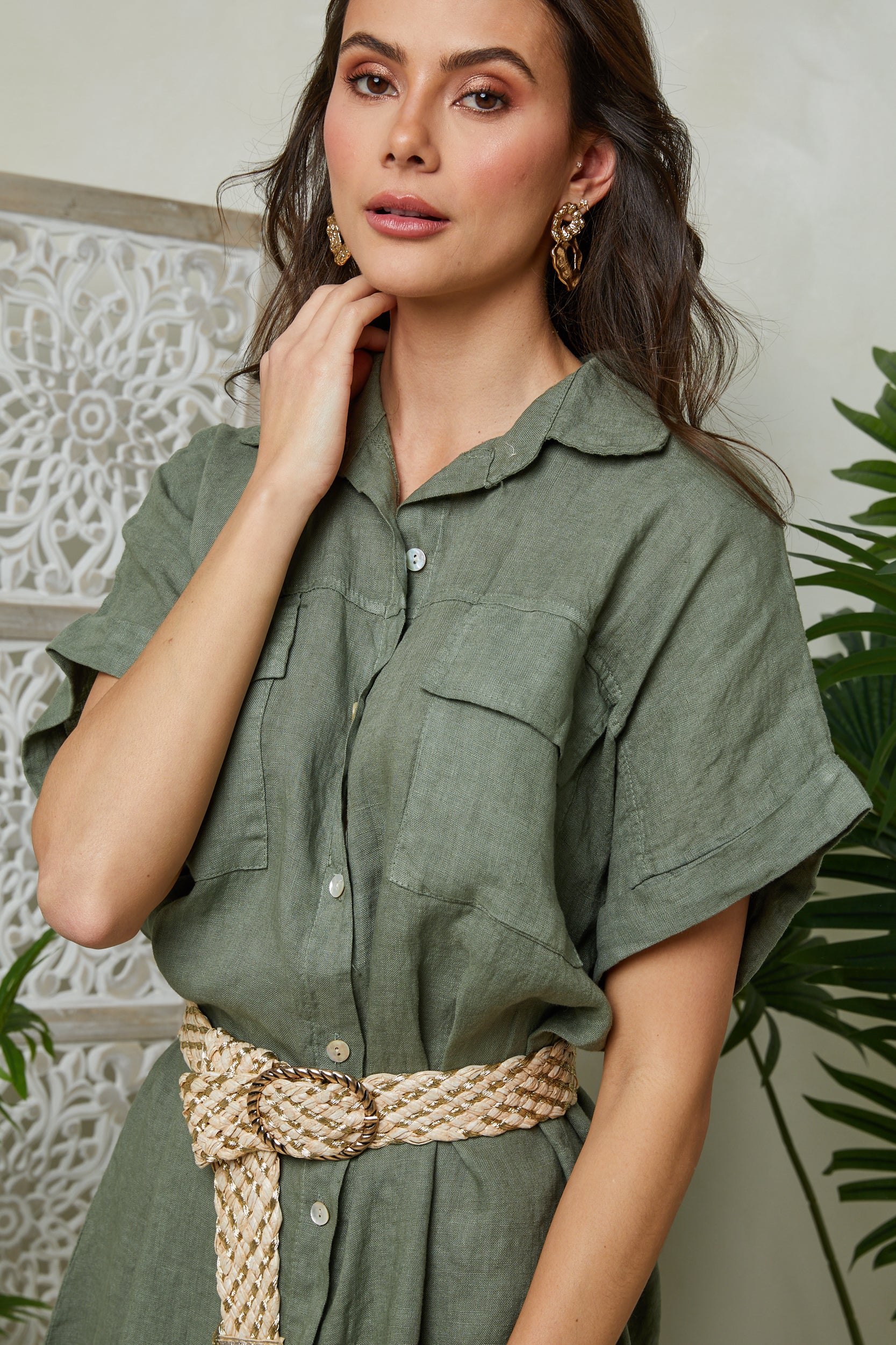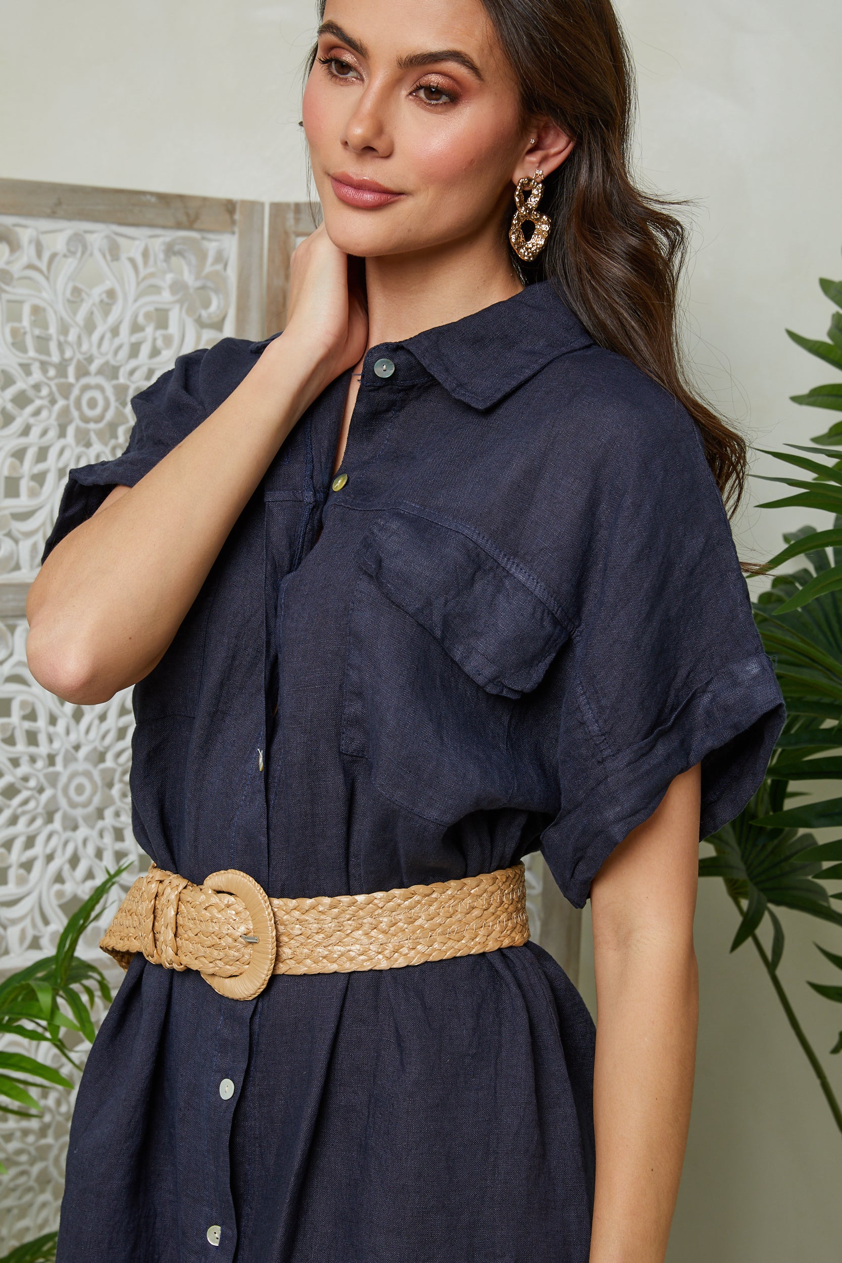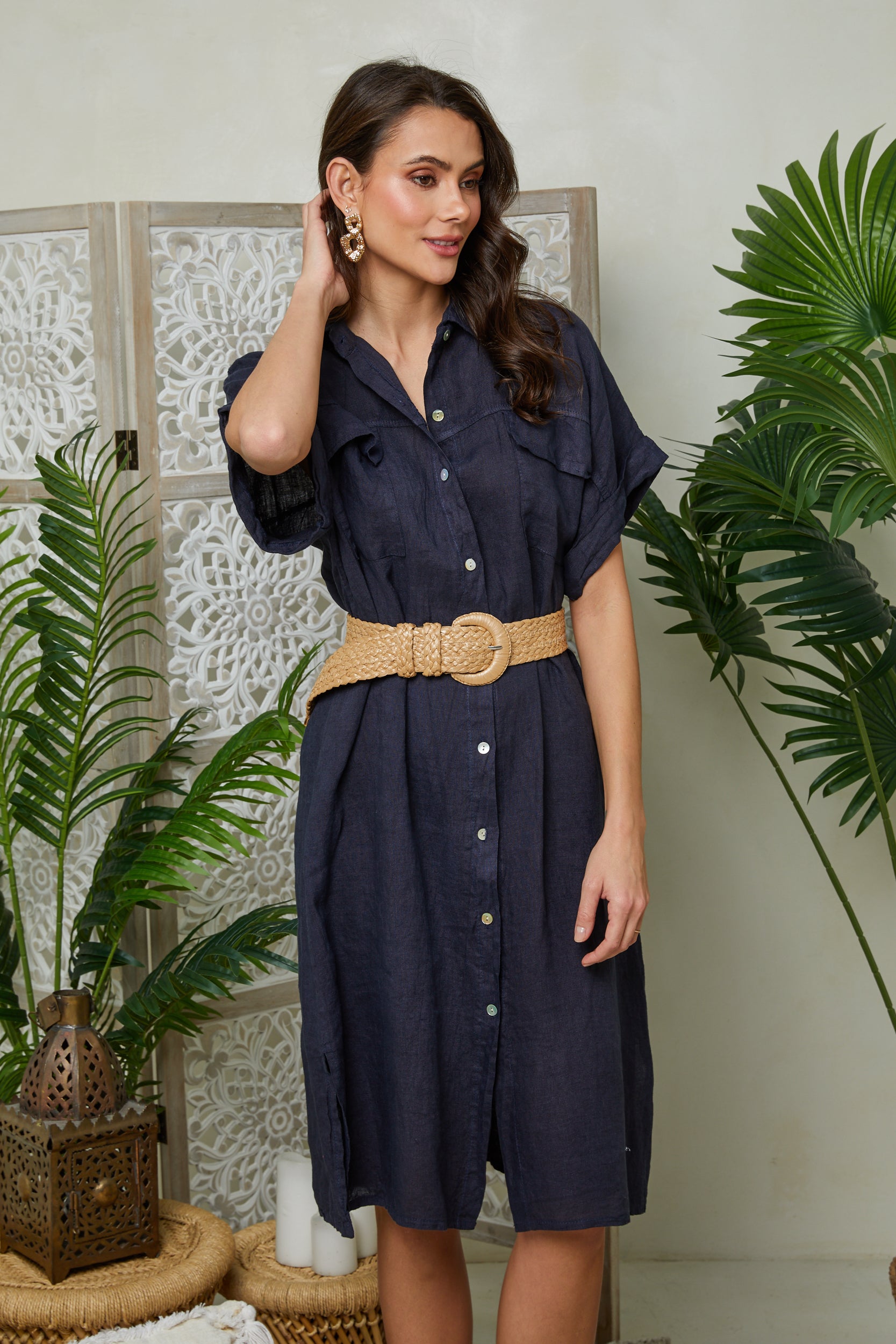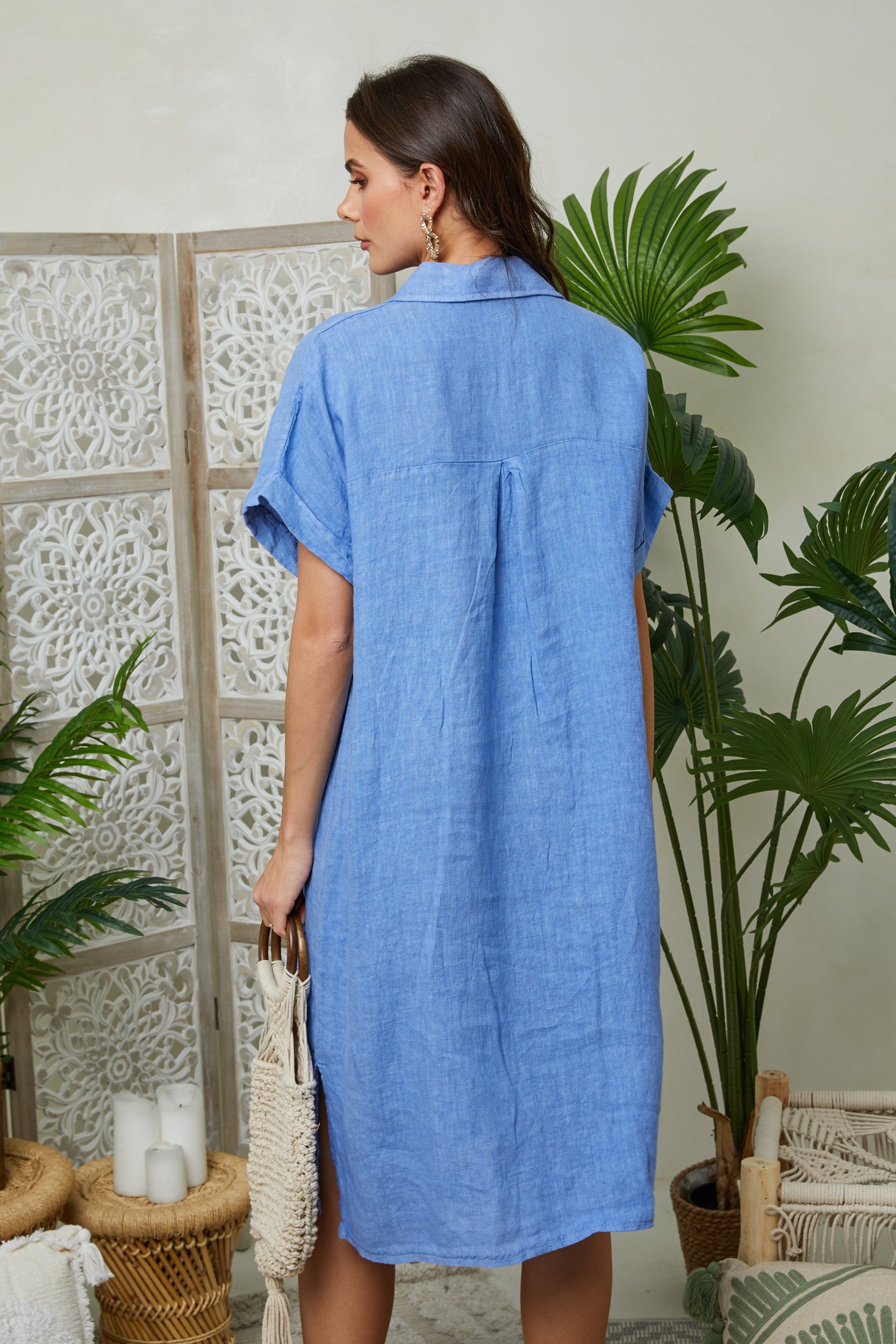 Robe chemise mi-longue manches courtes, avec deux poches au niveau de la poitrine et des fentes sur les côtés