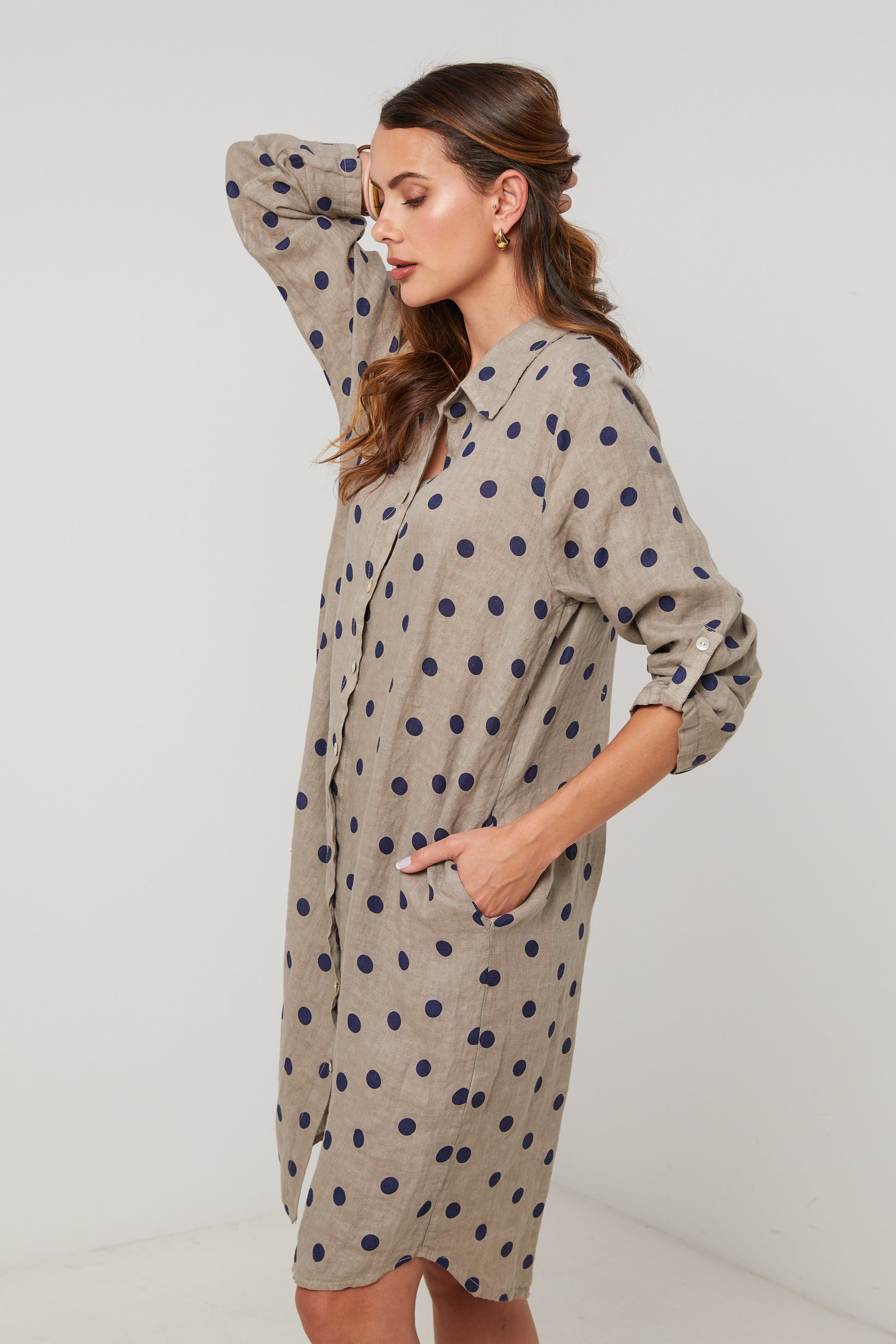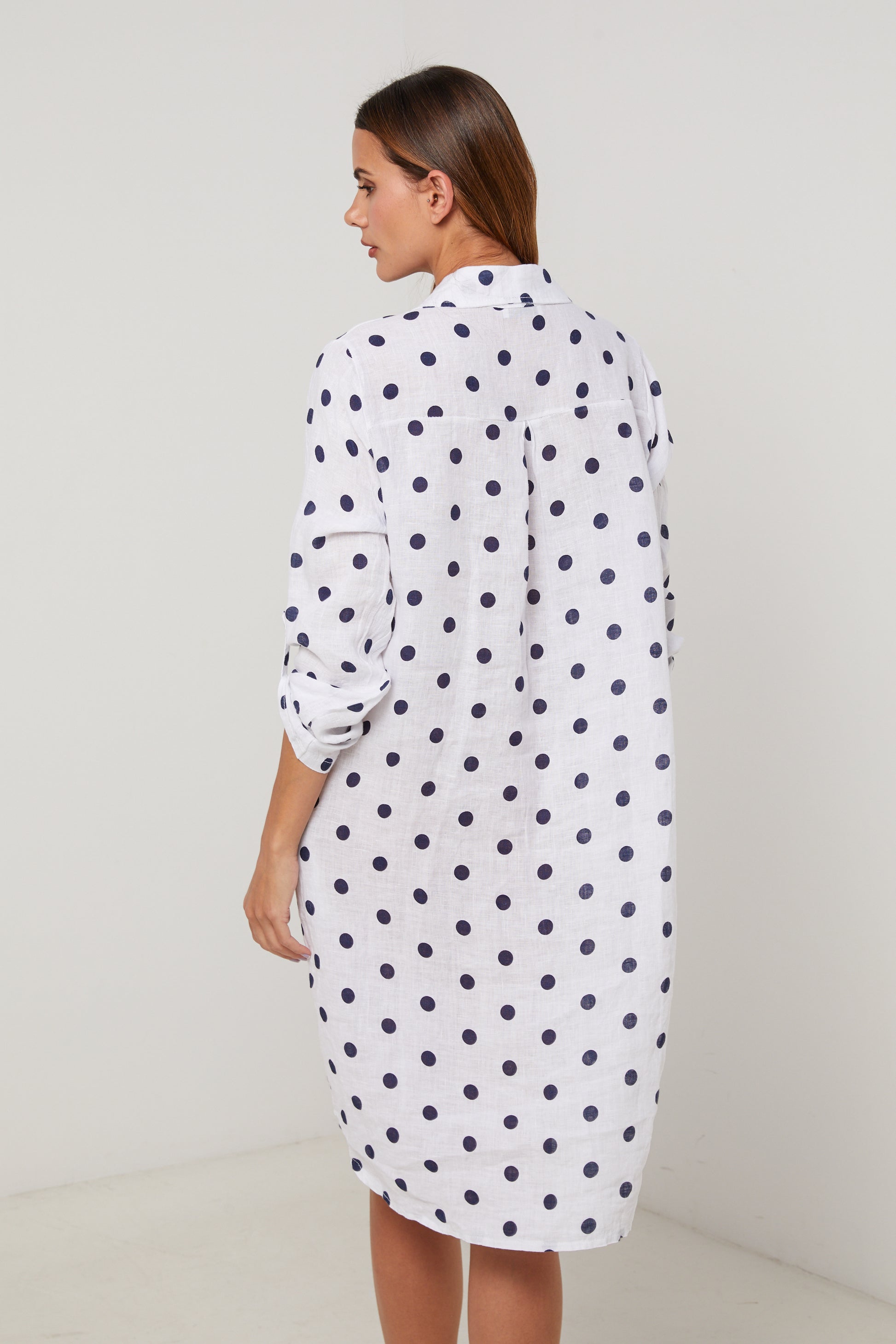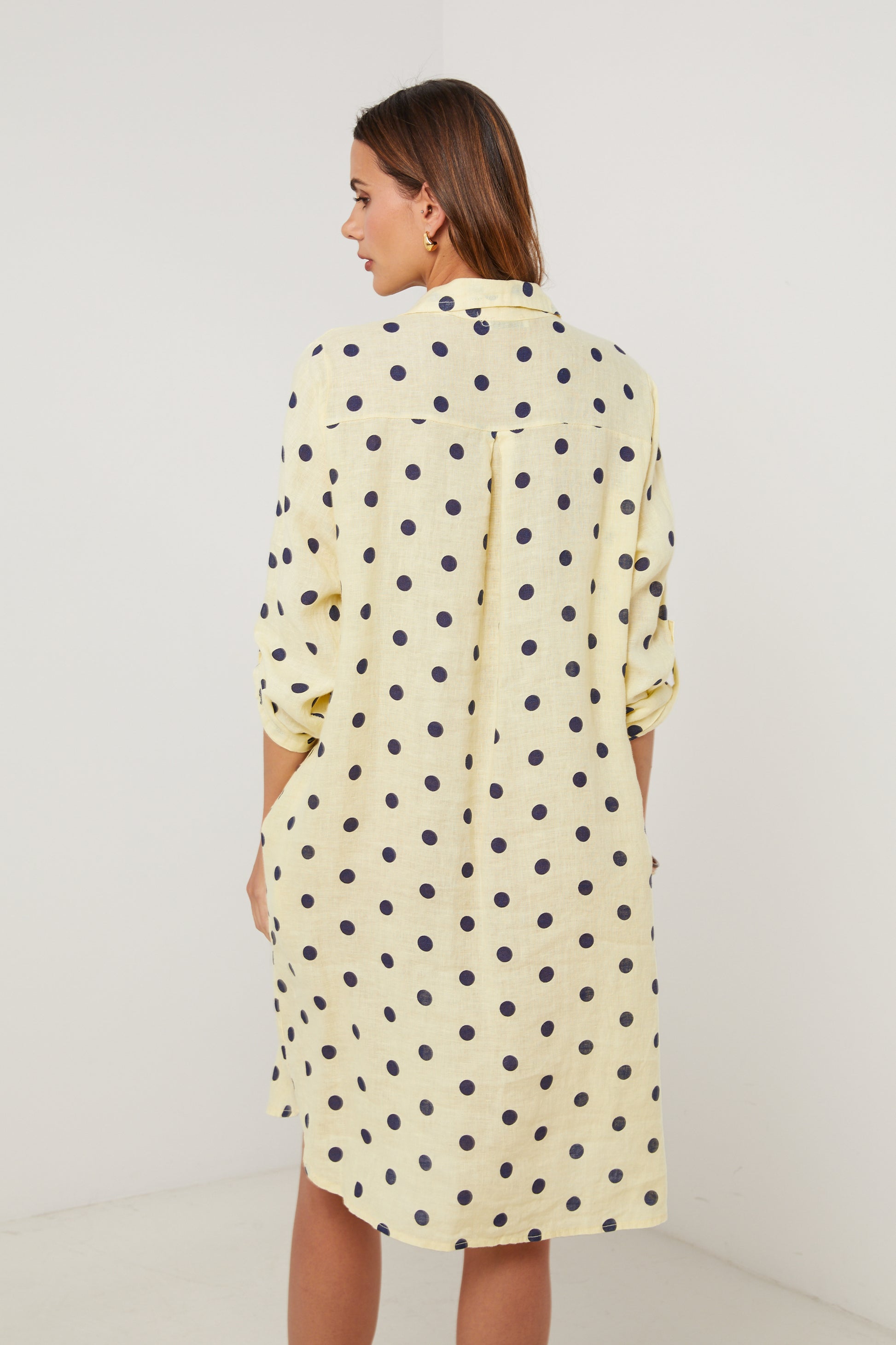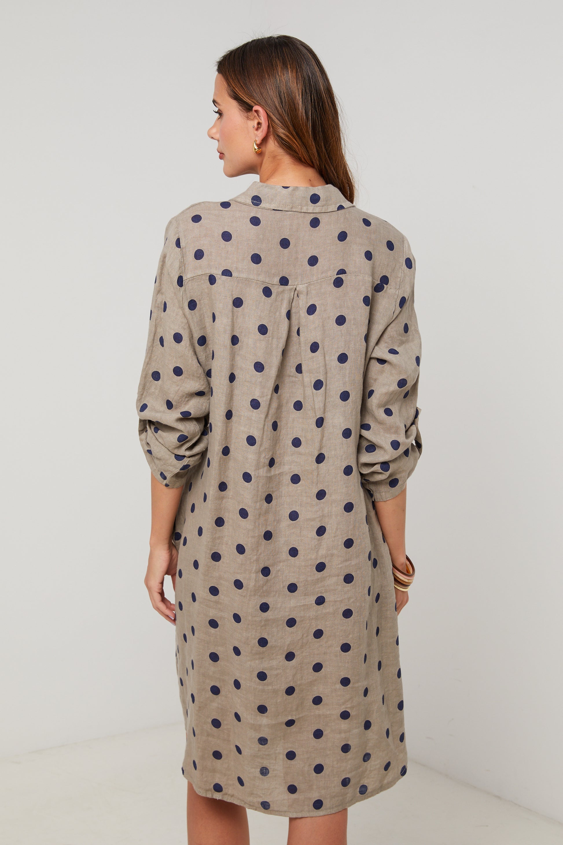 Robe chemise en lin mi longue, manches 3/4 a pates de boutonnage, motif à pois
