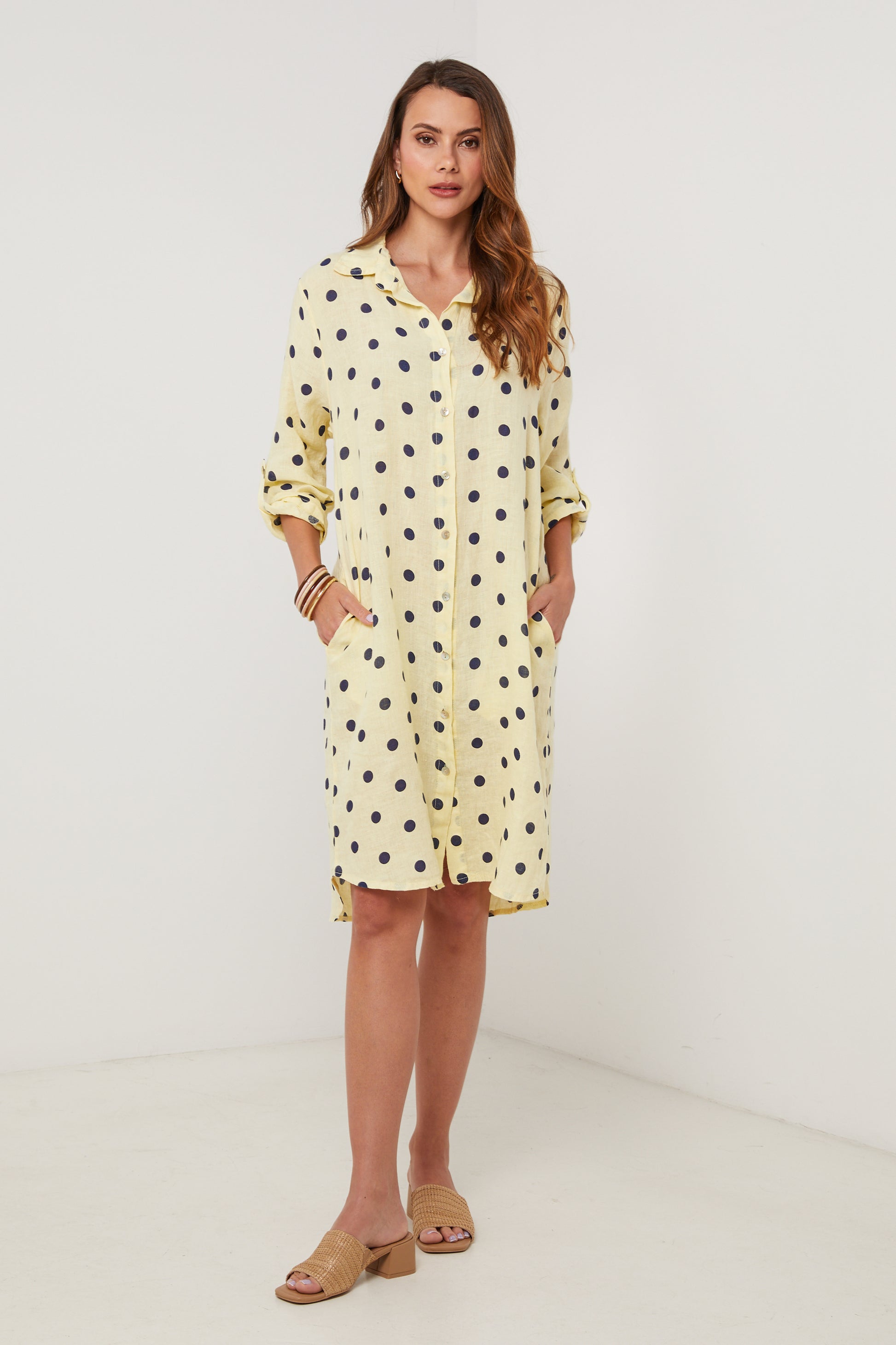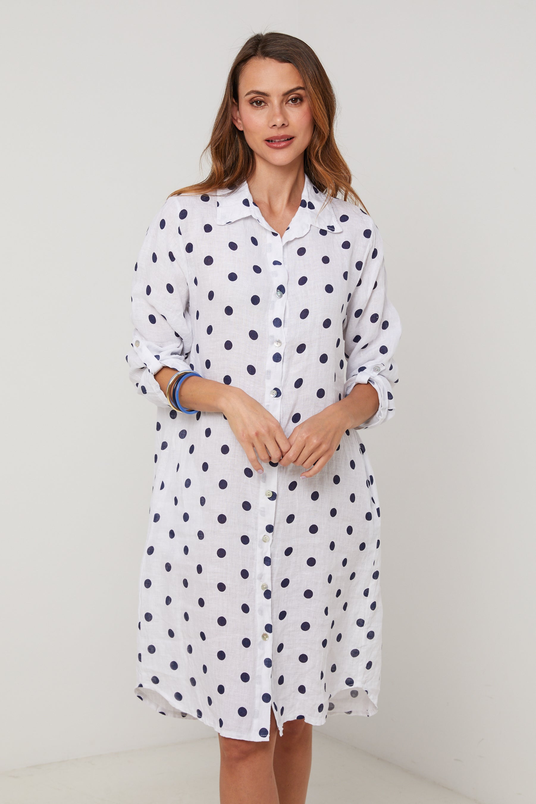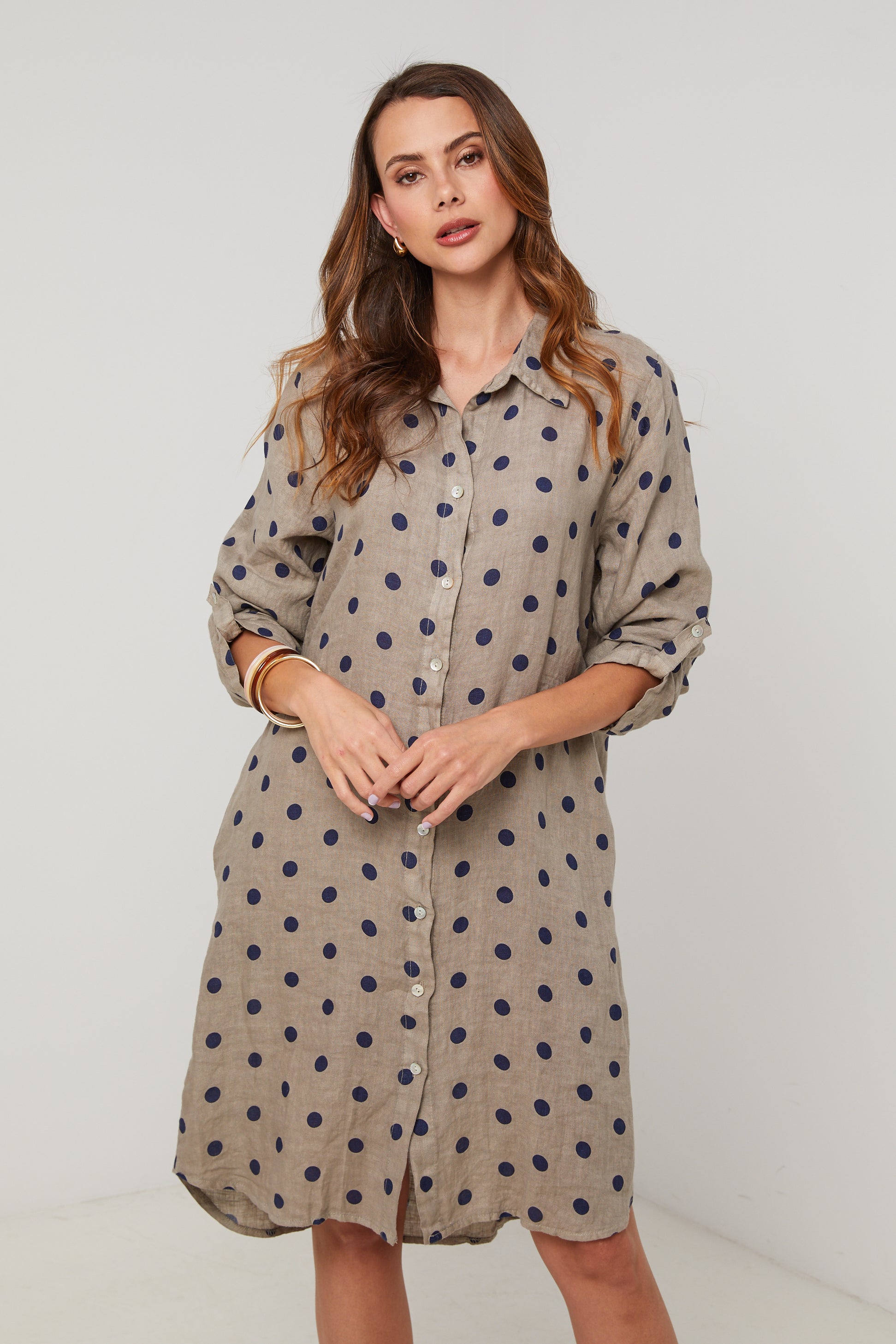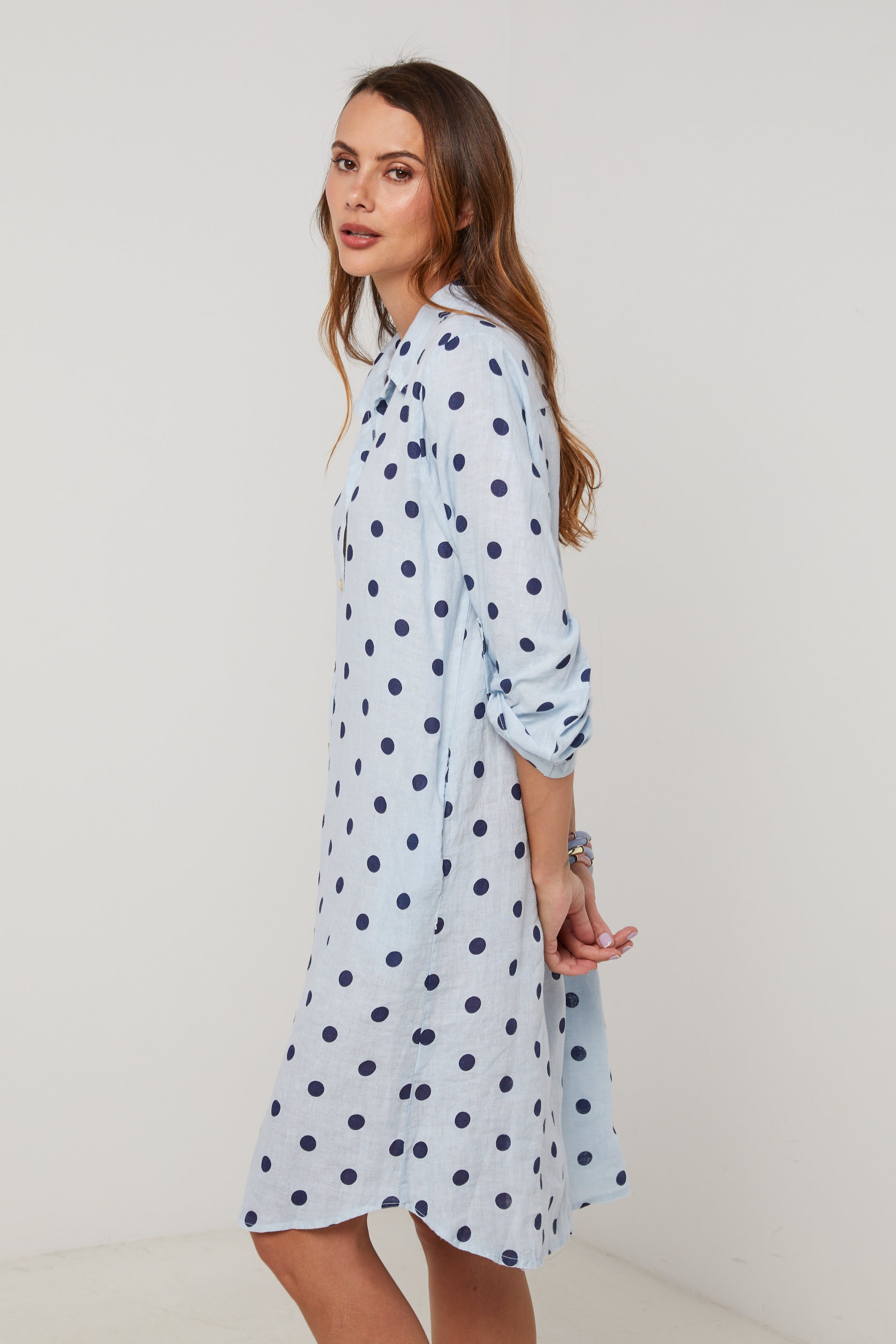 Robe chemise en lin mi longue, manches 3/4 a pates de boutonnage, motif à pois