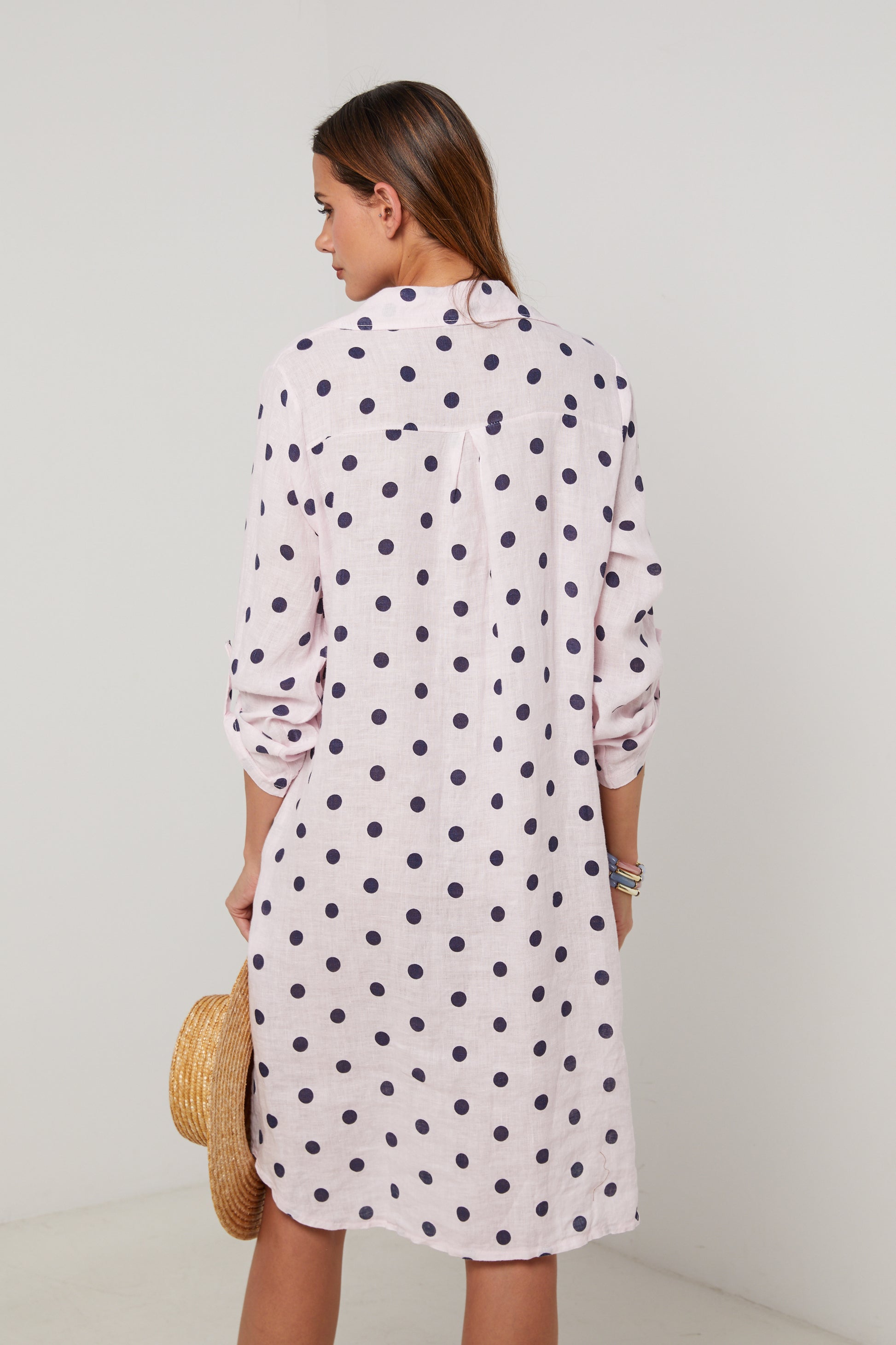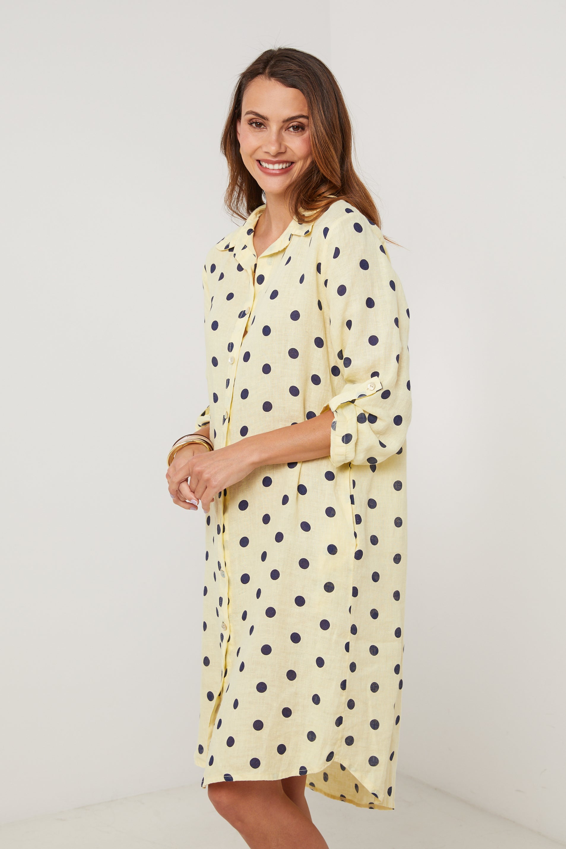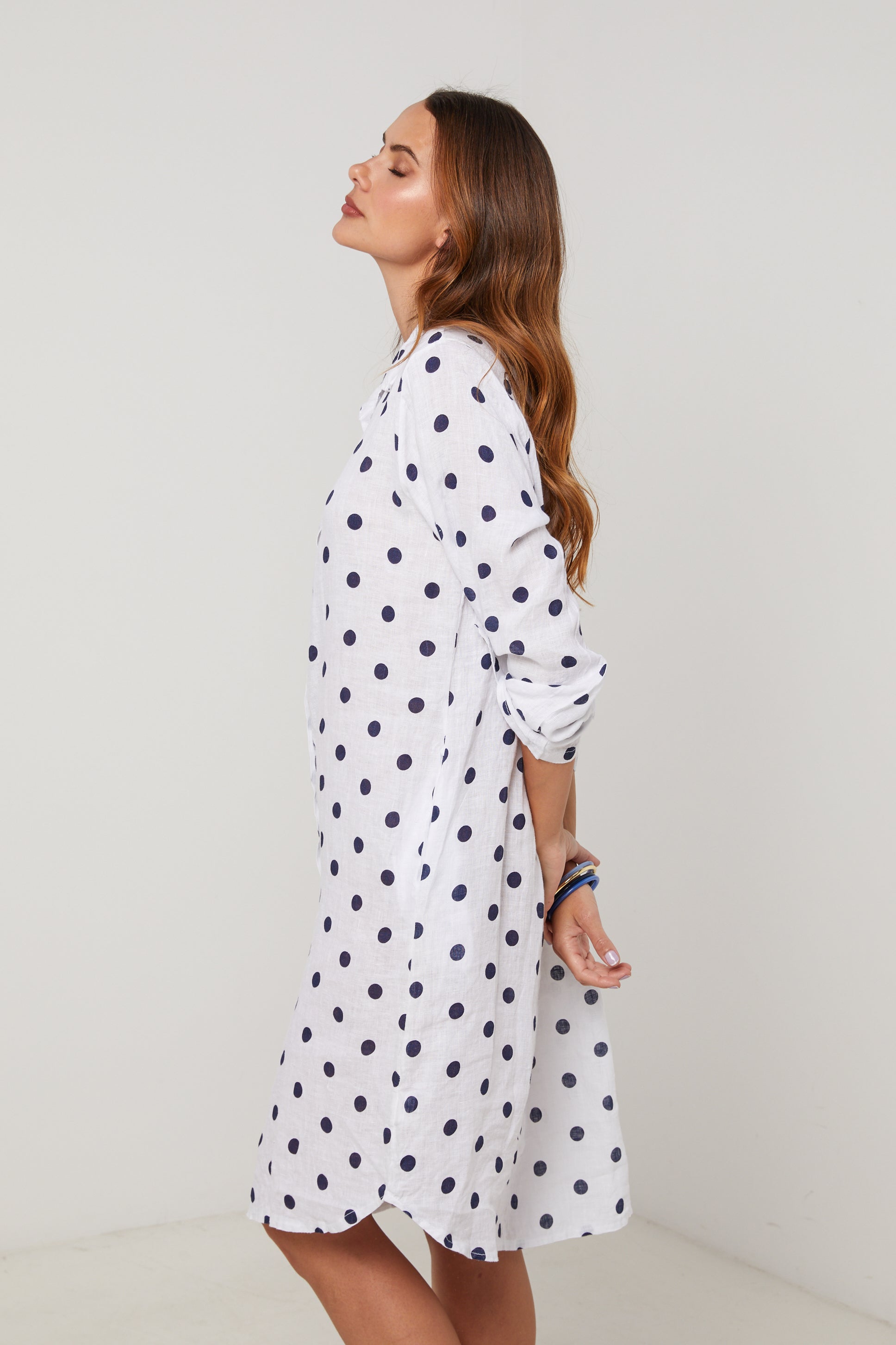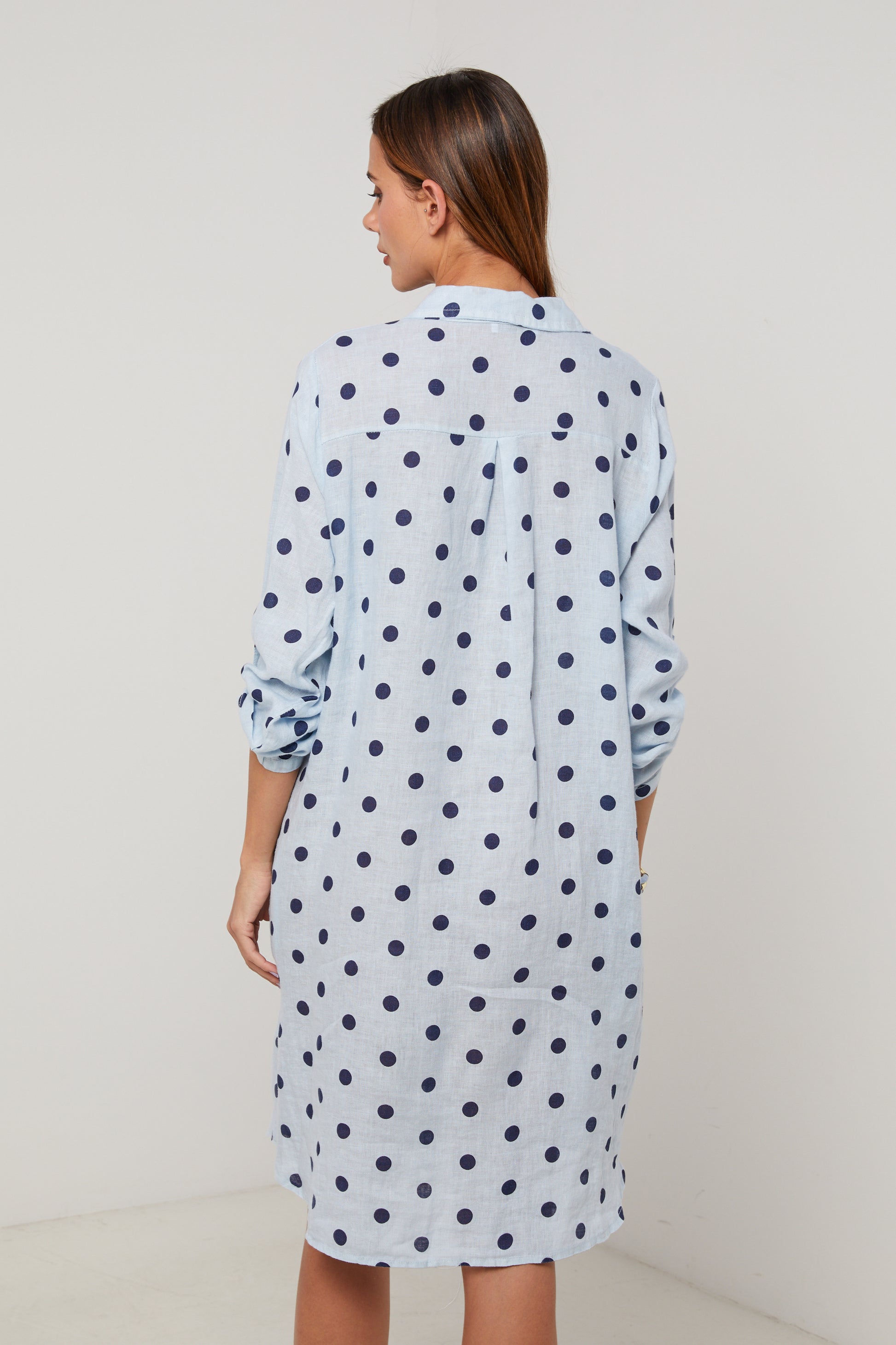 Robe chemise en lin mi longue, manches 3/4 a pates de boutonnage, motif à pois