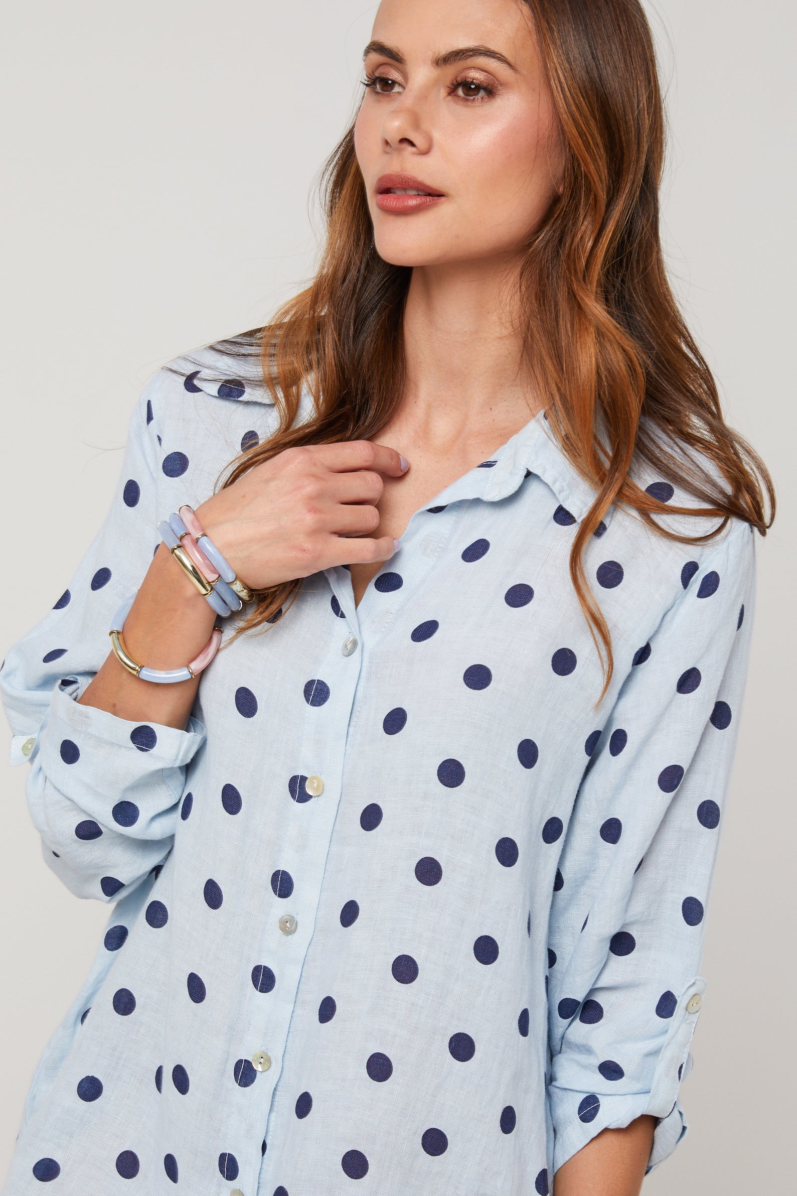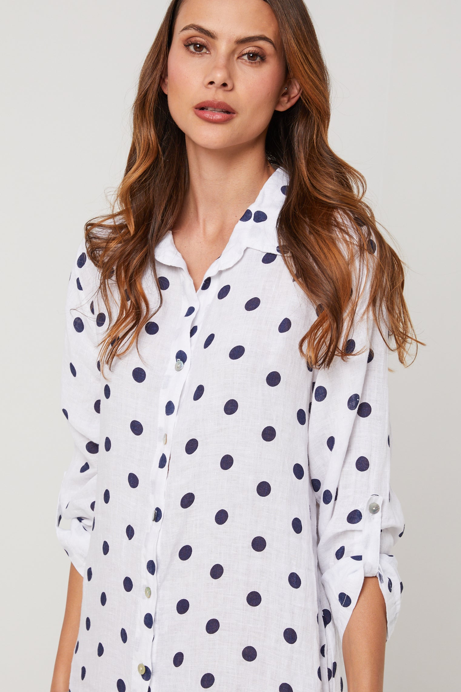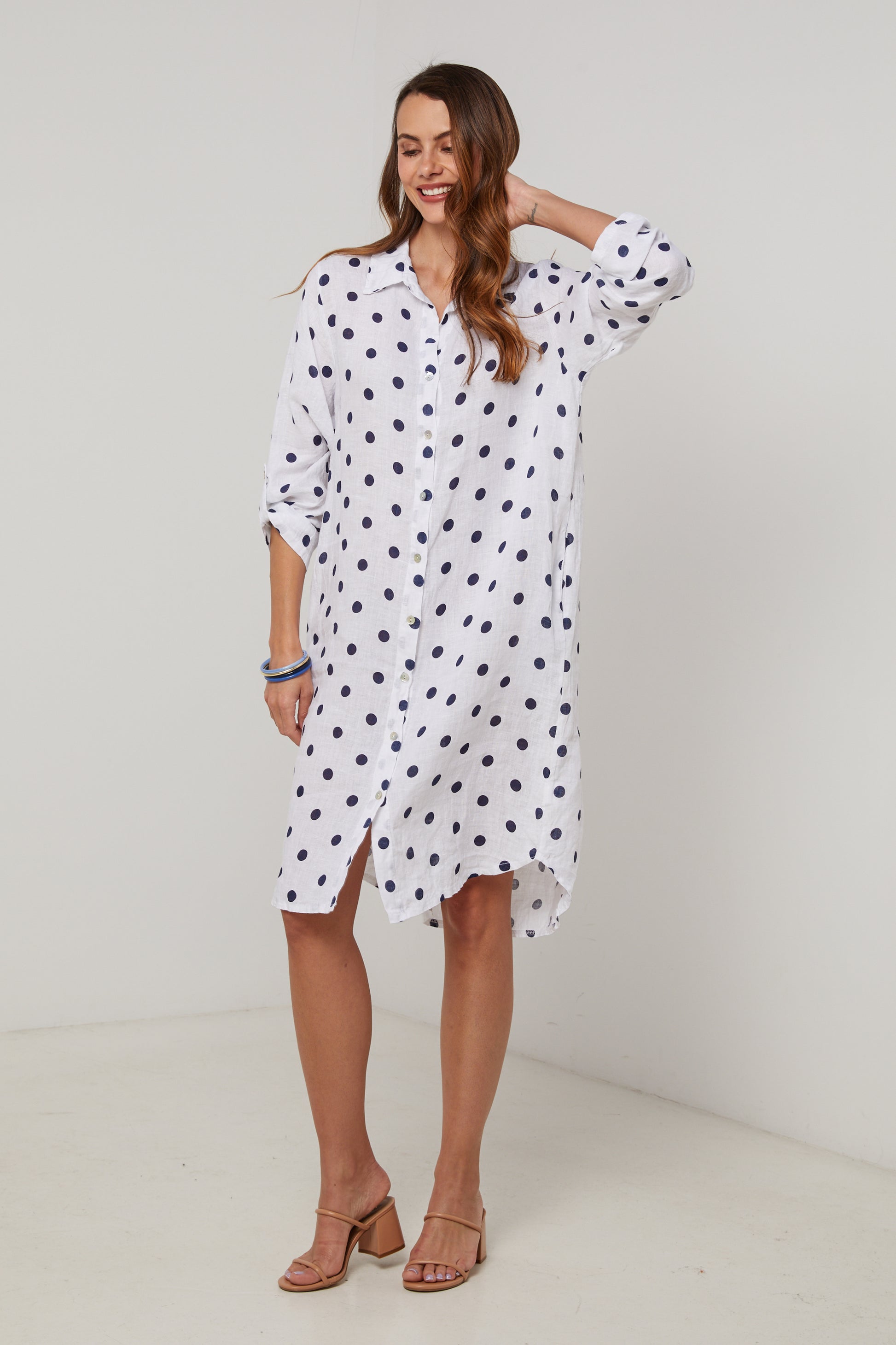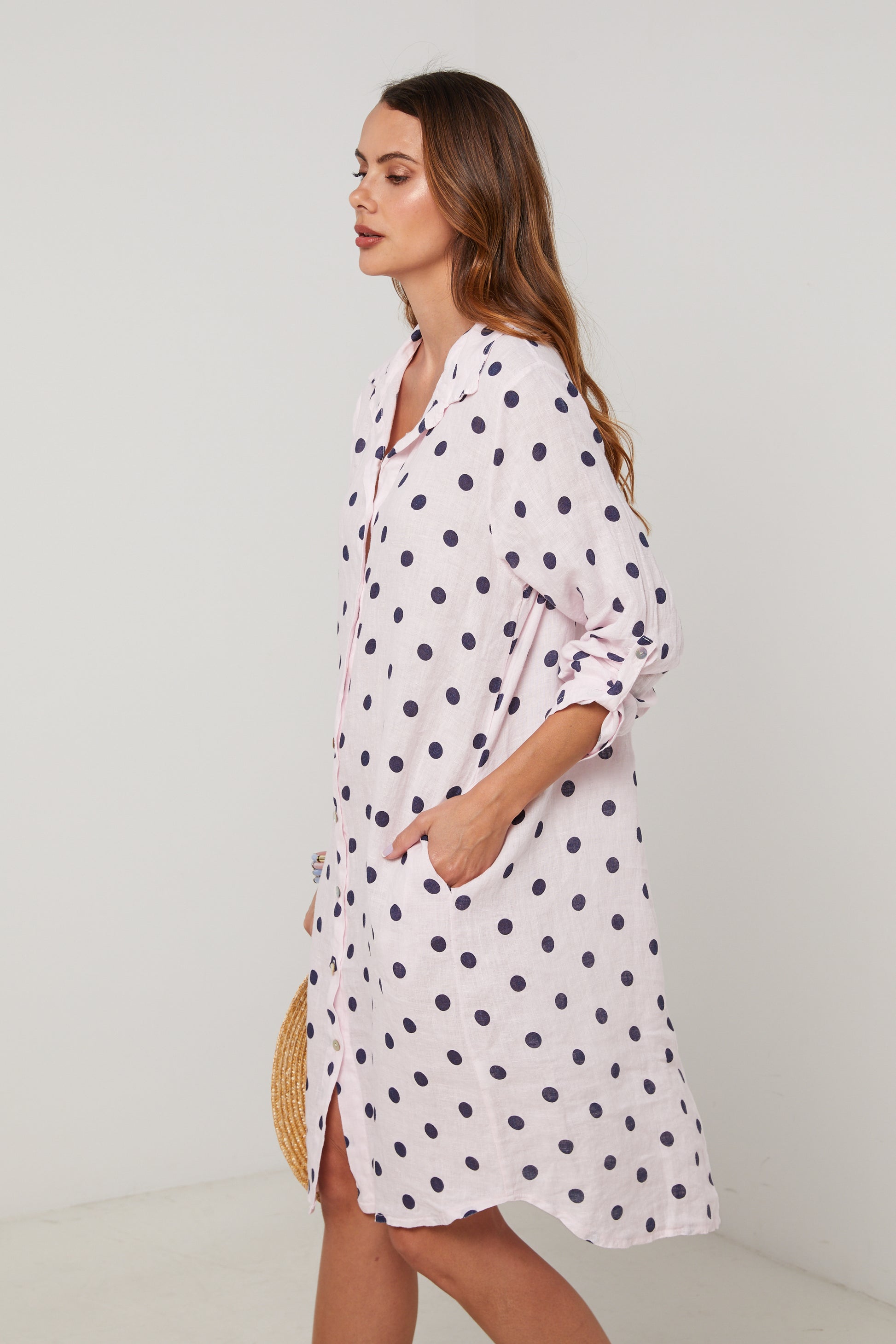 Robe chemise en lin mi longue, manches 3/4 a pates de boutonnage, motif à pois
