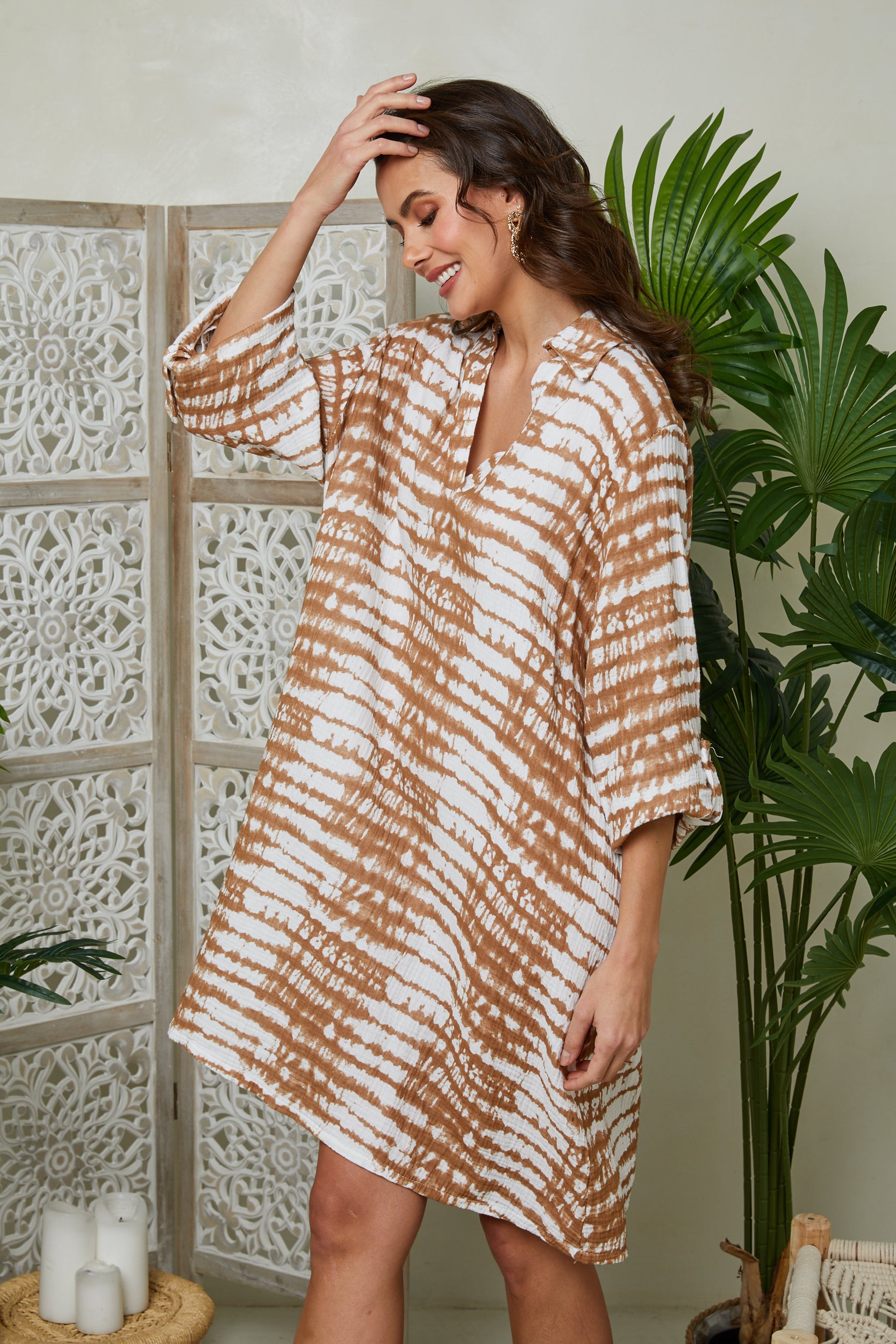 Robe mi-long Tie and dye, col chemise, manches longues avec pattes de boutonnage