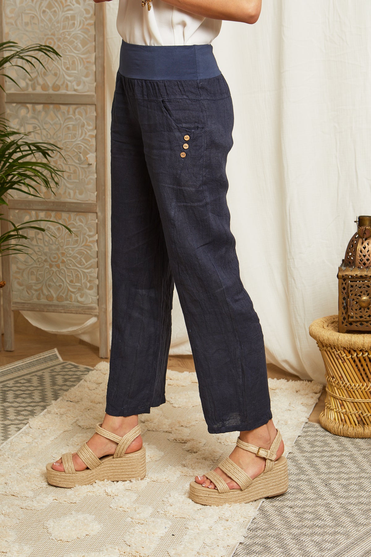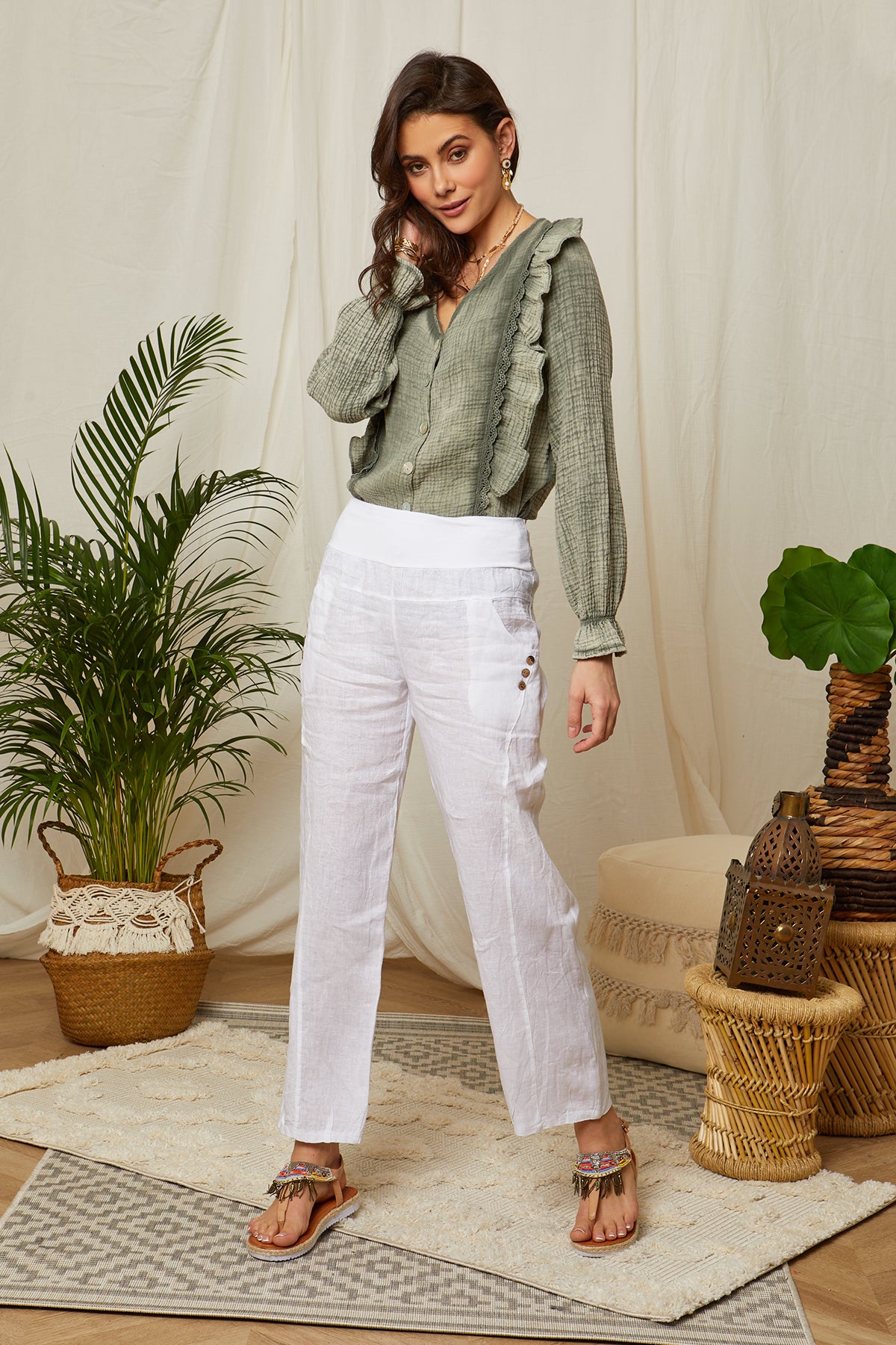 Ce pantalon en lin avec une taille élastique est confortable et facile à porter. Il peut être porté à la fois de manière décontractée et plus habillée, en fonction des accessoires et de la tenue avec laquelle il est associé.